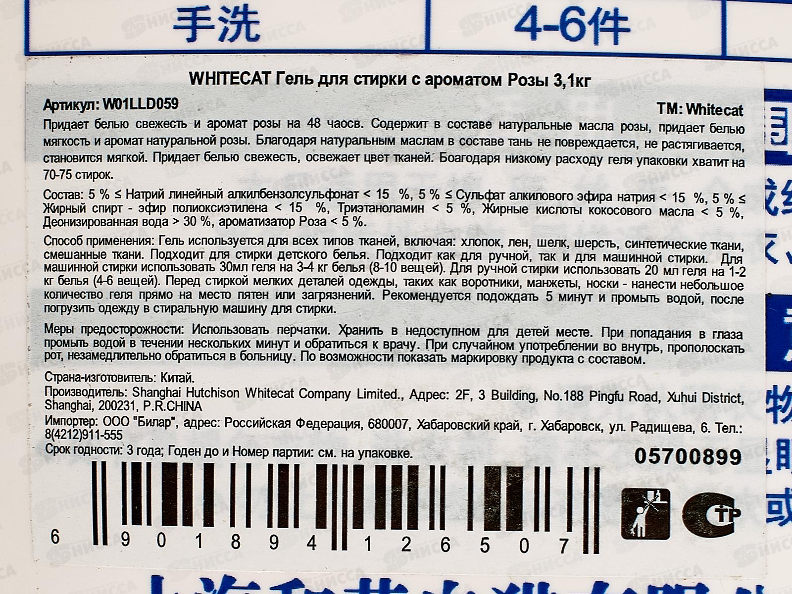 Whitecat Гель для стирки 2,3кг+800г Роза дой-пак *4
