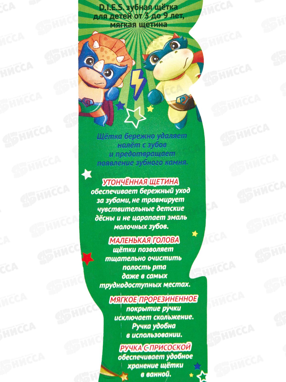 Зубная щётка D.I.E.S. для детей от 3 до 9 лет с мягкой щетиной бережно удаляет налёт с зубов и предотвращает появление зубного камня. Утончённая щетина обеспечивает бережный уход за зубами, не травмирует чувствительные детские дёсны и не царапает эмаль молочных зубов. Маленькая голова щётки позволяет тщательно очистить полость рта даже в самых труднодоступных местах.