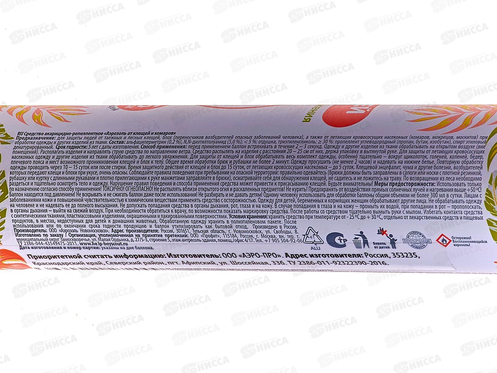 Аэрозоль помогает защититься от клещей, блох, а также от летающих кровососущих насекомых. Средством обрабатывают одежду, на открытом воздухе или в хорошо проветриваемом помещении, держа флакон вертикально на вытянутой руке, с расстояния 20-25 см от нее. Состав: Действующее вещество: альфациперметрин, N,N-диэтилтолуамид.