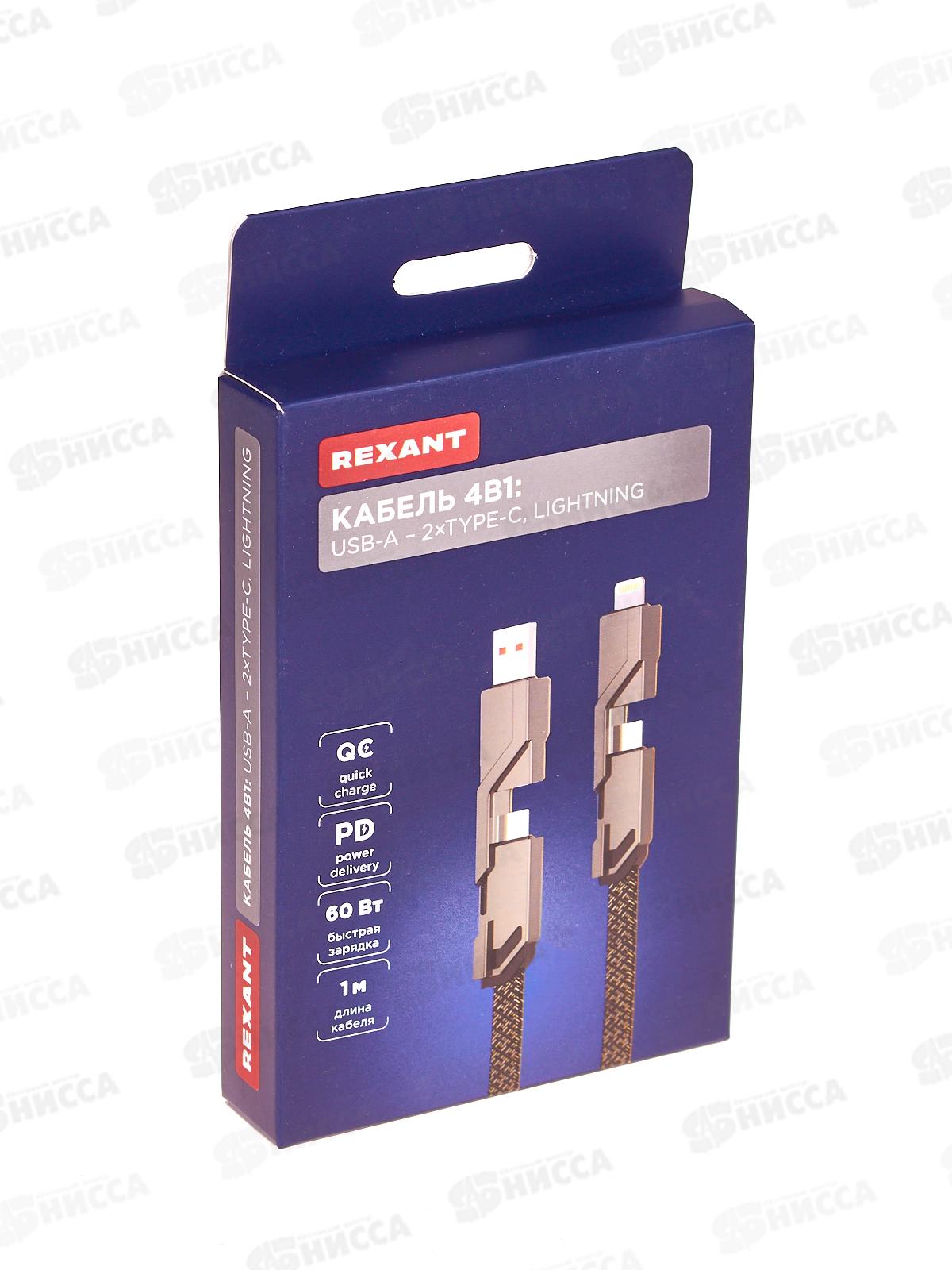 Код:595016; Кабель 4в1 USB-А Type-C, Lightning Type-C, 60Вт, 1м, в черной оплетке REXANT, 18-1128