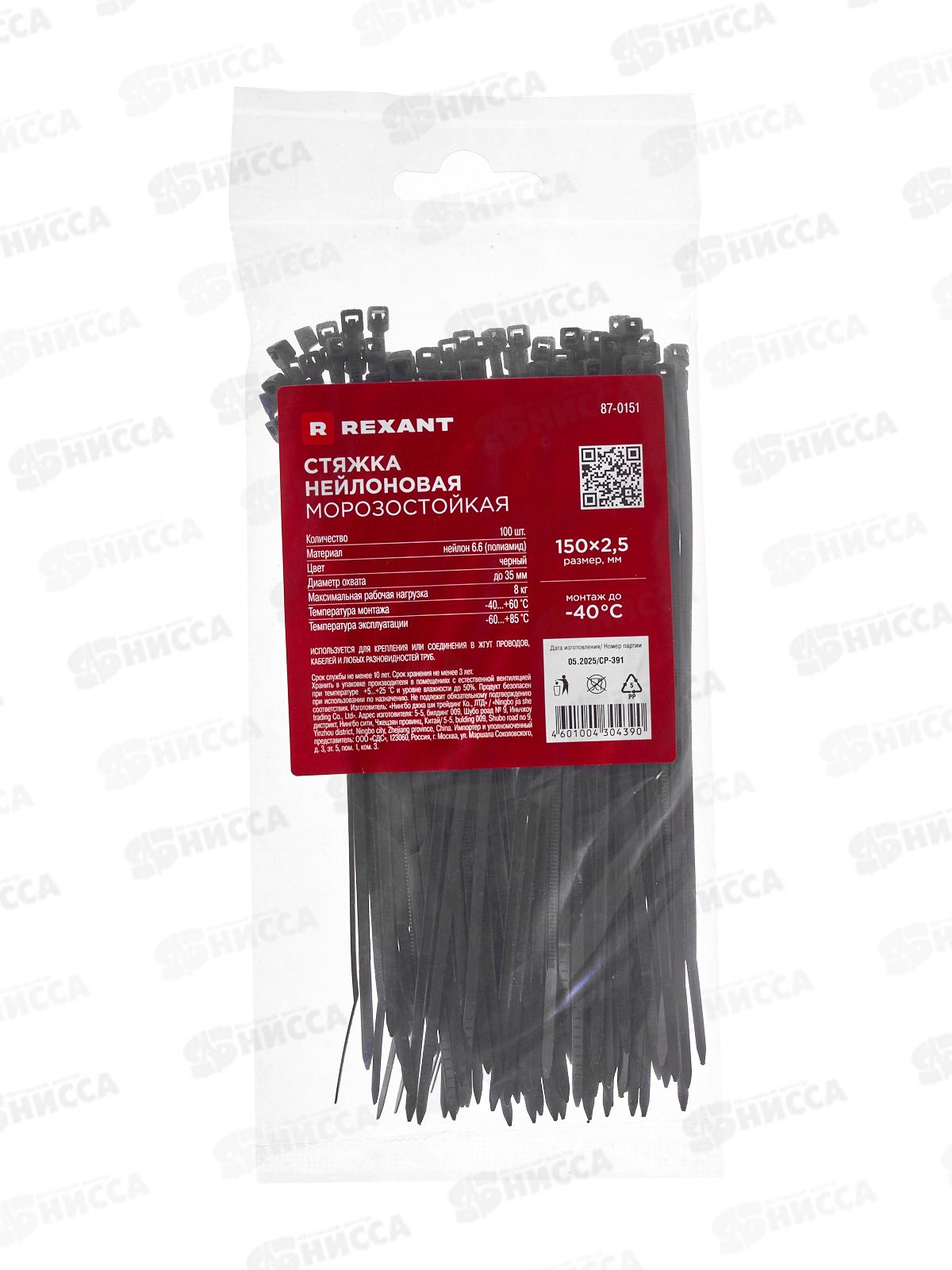 Код:594993; Стяжка нейлоновая морозостойкая 150*2,5мм, черная 100шт, REXANT, 87-0151