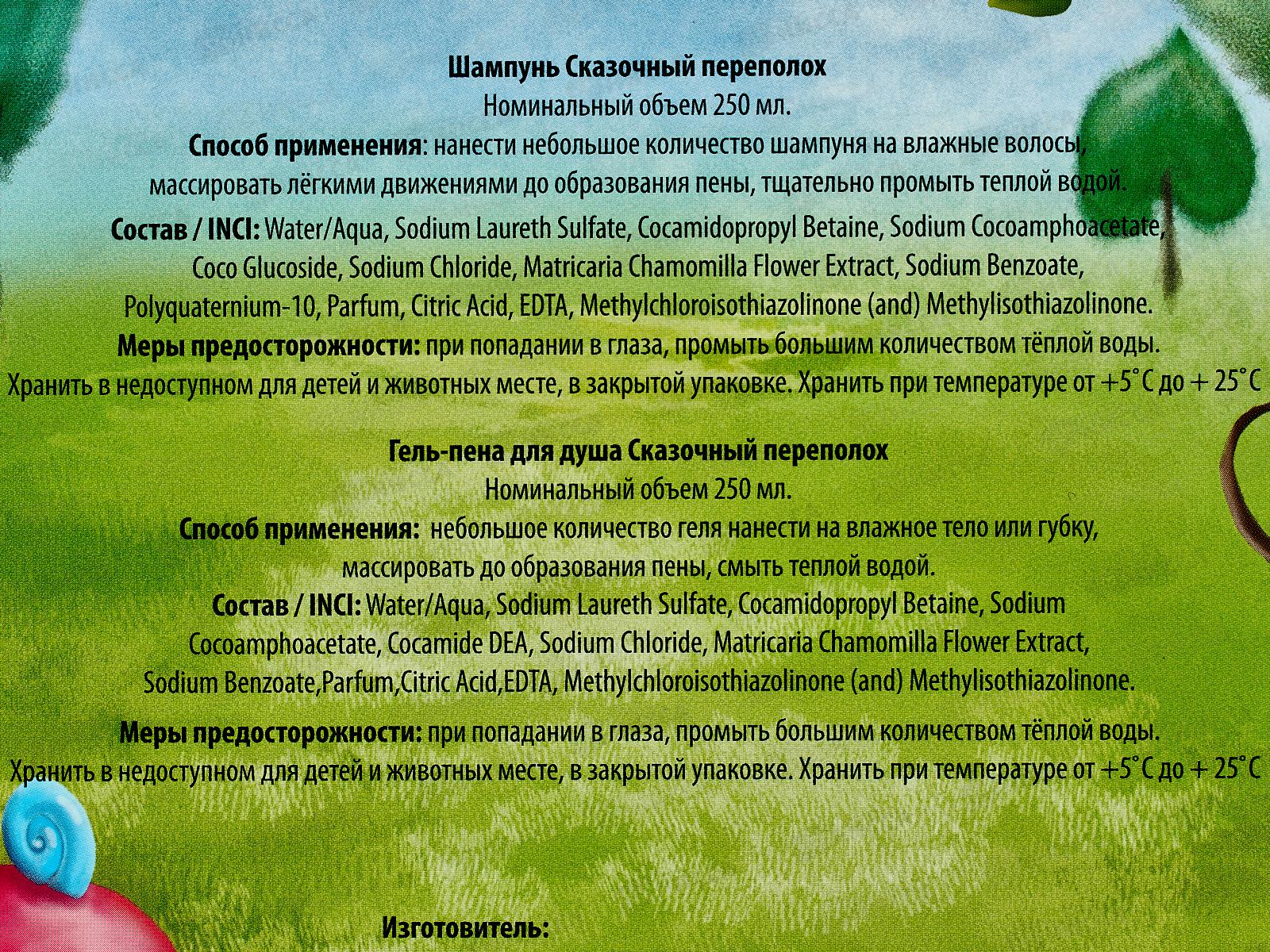 Состав шампуня: вода, Лауретсульфат натрия, Кокамидопропилбетаин, Кокоамфоацетат натрия, Кокоглюкозид, Хлорид натрия, Экстракт цветков Марикарии Ромашковой, Бензоат натрия, Полигуатерниум-10, Отдушка, Лимонная кислота, ЭДТА, Метилхлоризотиазолинон (и) Метилизотиазолинон. Состав геля: вода, Лауретсульфат натрия, Кокамидопропилбетаин, Кокоамфоацетат натрия, Кокамид ДЭА, Хлорид натрия, Экстракт цветков ромашки, Бензоат натрия, Отдушка, Лимонная кислота, ЭДТА, Метилхлоризотиазолинон (и) Метилизотиазолинон.