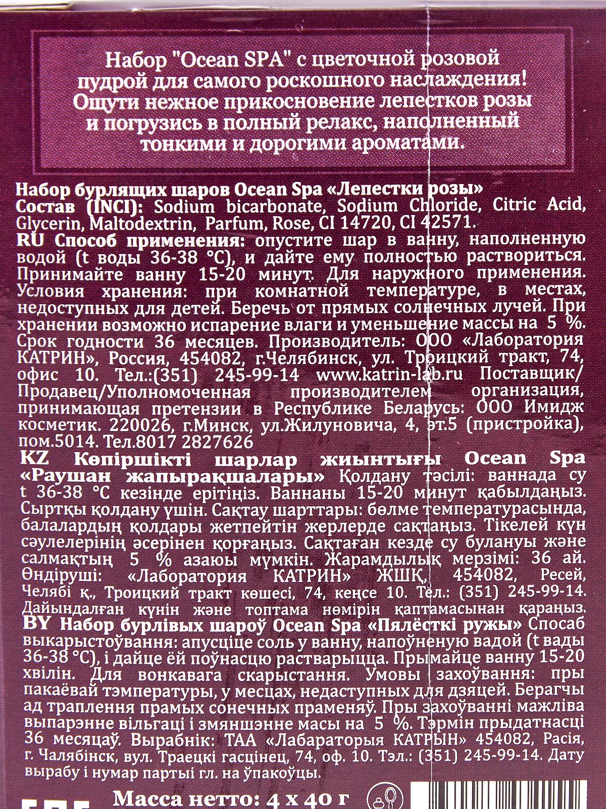 Состав: бикарбонат натрия, хлорид натрия, лимонная кислота, глицерин, мальтодекстрин, отдушка, роза, CI 14720, CI 42571.