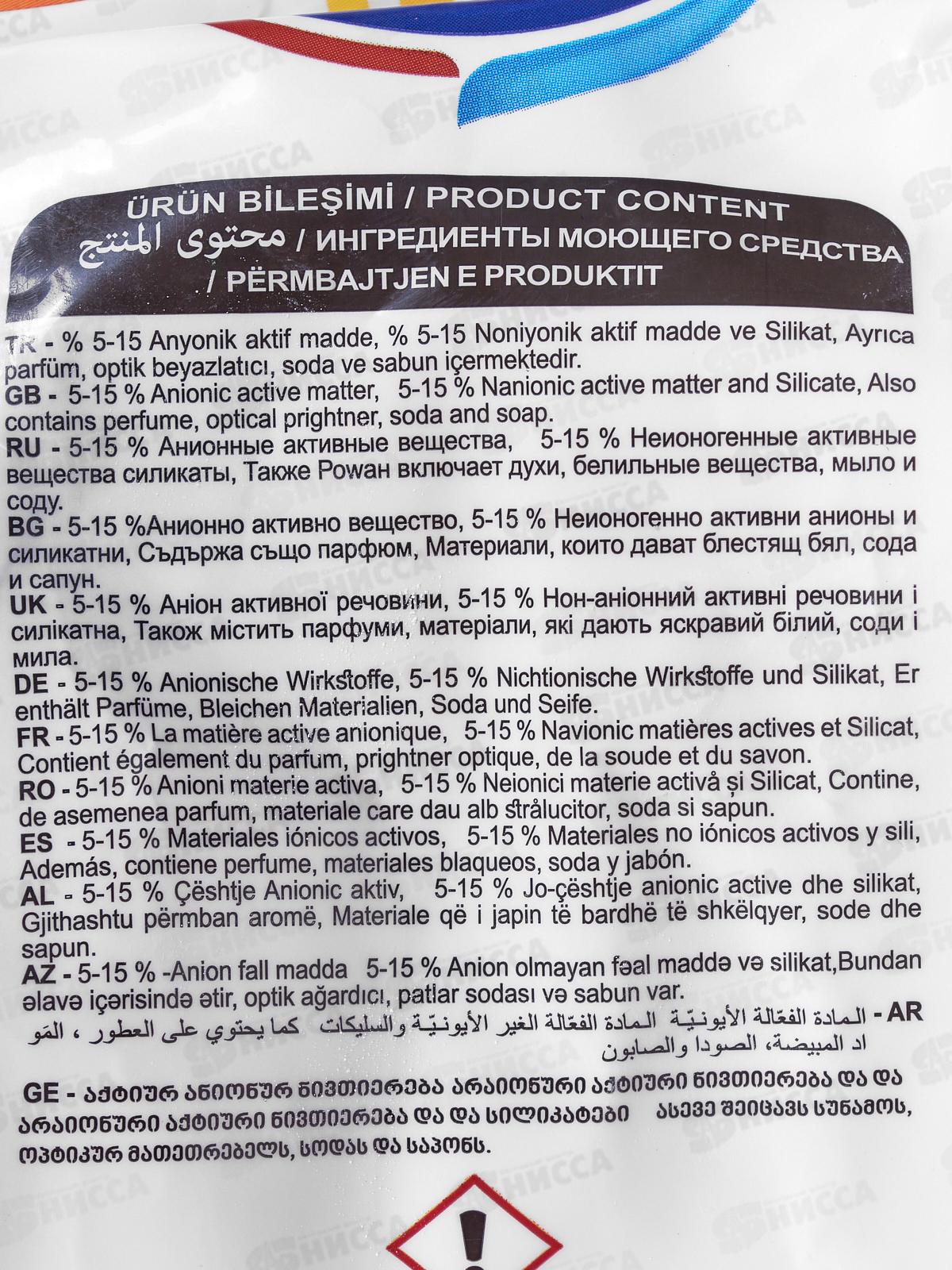 Состав: 5-15% анионные ПАВ, 5-5% неионогенные ПАВ, силикаты, отдушка, белильные вещества, мыло, сода.