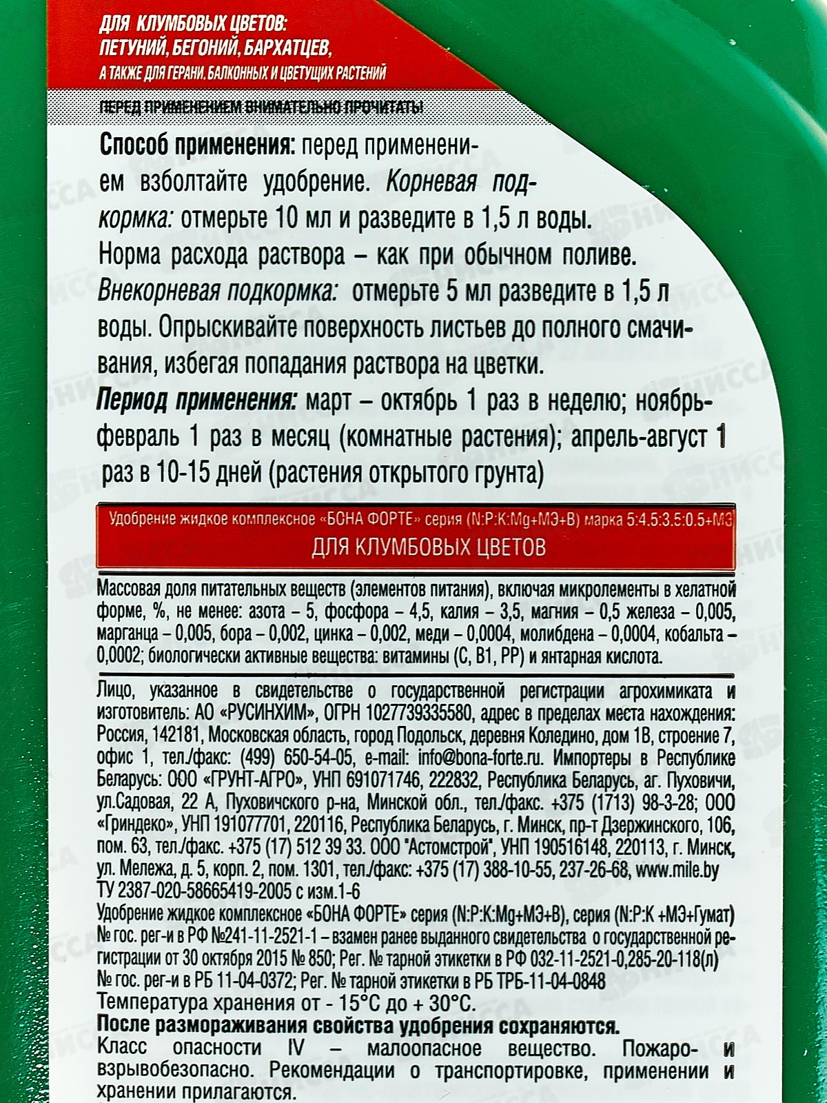СОСТАВ Три основных макроэлемента (NPK): Азот (N) - 5 %, фосфор (P2O5) – 4,5 %, калий (K2O) – 3,5 %. Основной мезоэлемент (Mg): магний (MgO) – 0,6 %. Семь микроэлементов: Бор, железо, марганец, цинк, медь, молибден, кобальт. Из них шесть микроэлементов в хелатной форме: (железо, марганец, цинк, медь, молибден, кобальт). Комплекс витаминов: B1, PP, С. Стимулятор роста: янтарная кислота.