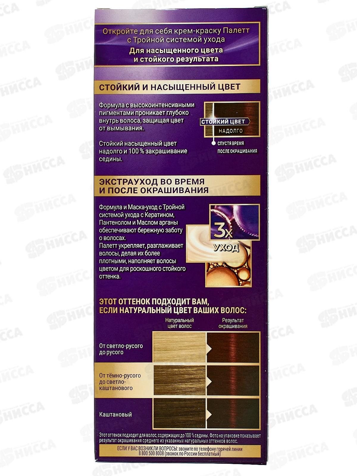 Откройте для себя Стойкую крем-краску Palette с Тройной системой ухода с Кератином, Пантенолом, Nutri-маслом, обеспечивающей бережную заботу о волосах. Формула с высокоинтенсиными пигментами глубоко проникает в структуру волоса, защищая цвет от вымывания. Для стойкого и интенсивного цвета. Ухаживающая краска, обогащенная пленительным цветом Ваших волос, удовлетворяющим все ваши потребности: насыщенный, экстрастойкий оттенок, ухоженные волосы, даже при регулярном окрашивании, живой блеск. Надежное закрашивание седины.