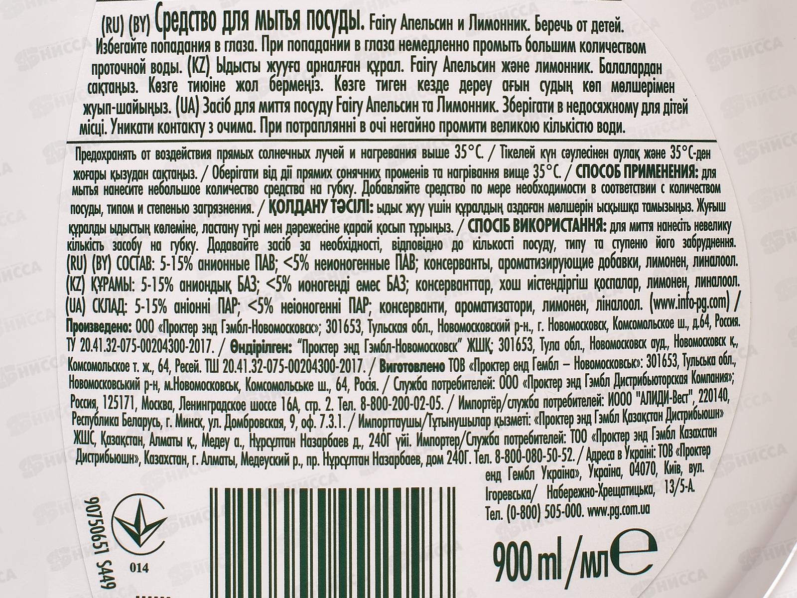 ФЭЙРИ 900мл жидкость для посуды (Апельсин)-лимон *12