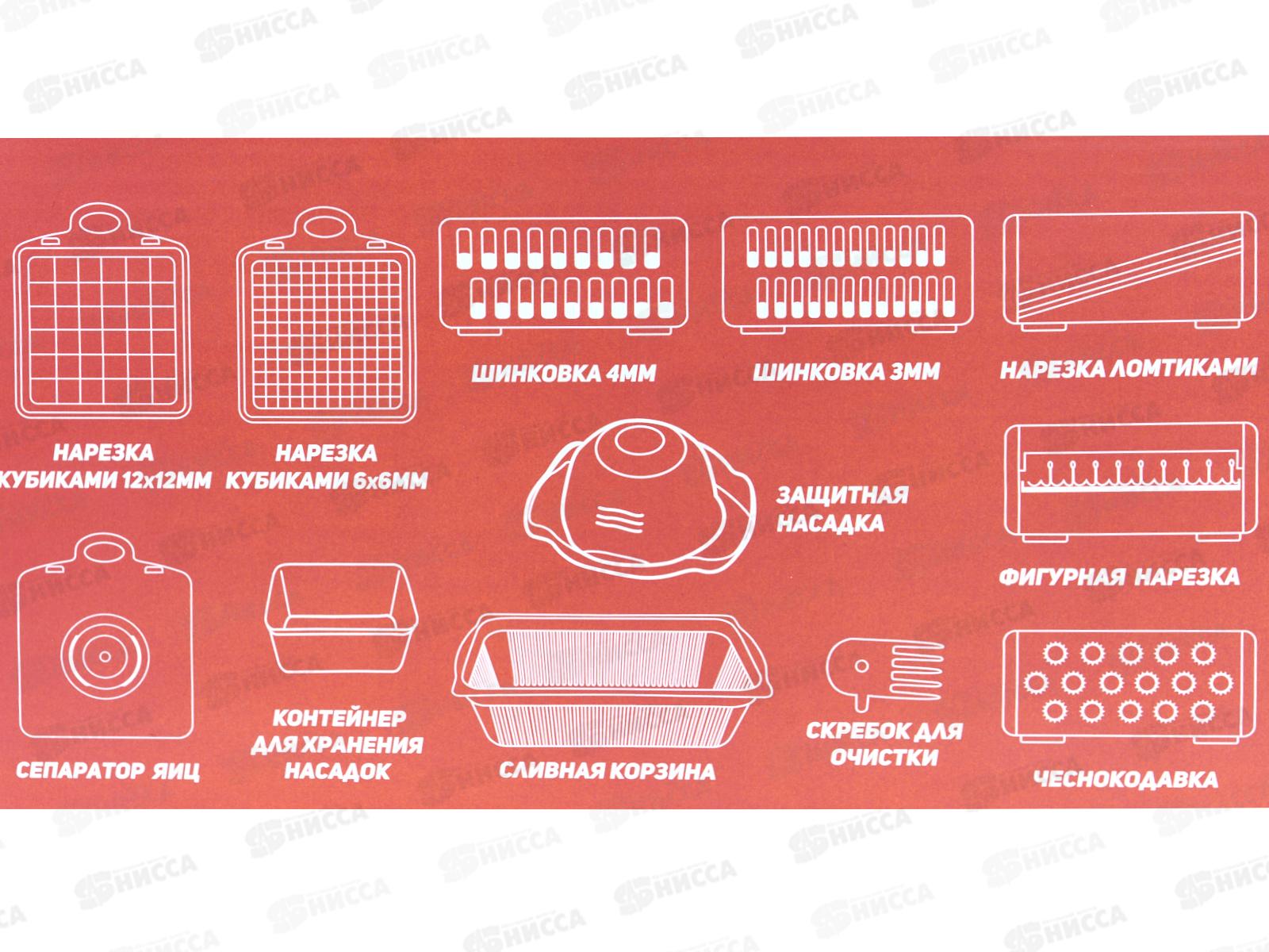 Овощерезка для нарезки кубиками, ломтиками и соломкой. В комплект входит 12 аксессуаров: - насадка для нарезки ломтиками, - 2 насадки для шинковки (3 и 4 мм), - насадка для фигурной нарезки, - насадка-чеснокодавка, - 2 насадки со стальными ножами для нарезки кубиками (6 мм и 12 мм), - сепаратор яиц, - контейнер для хранения насадок, - сливная корзина, - защитная насадка, - зубчатый скребок для очистки.
