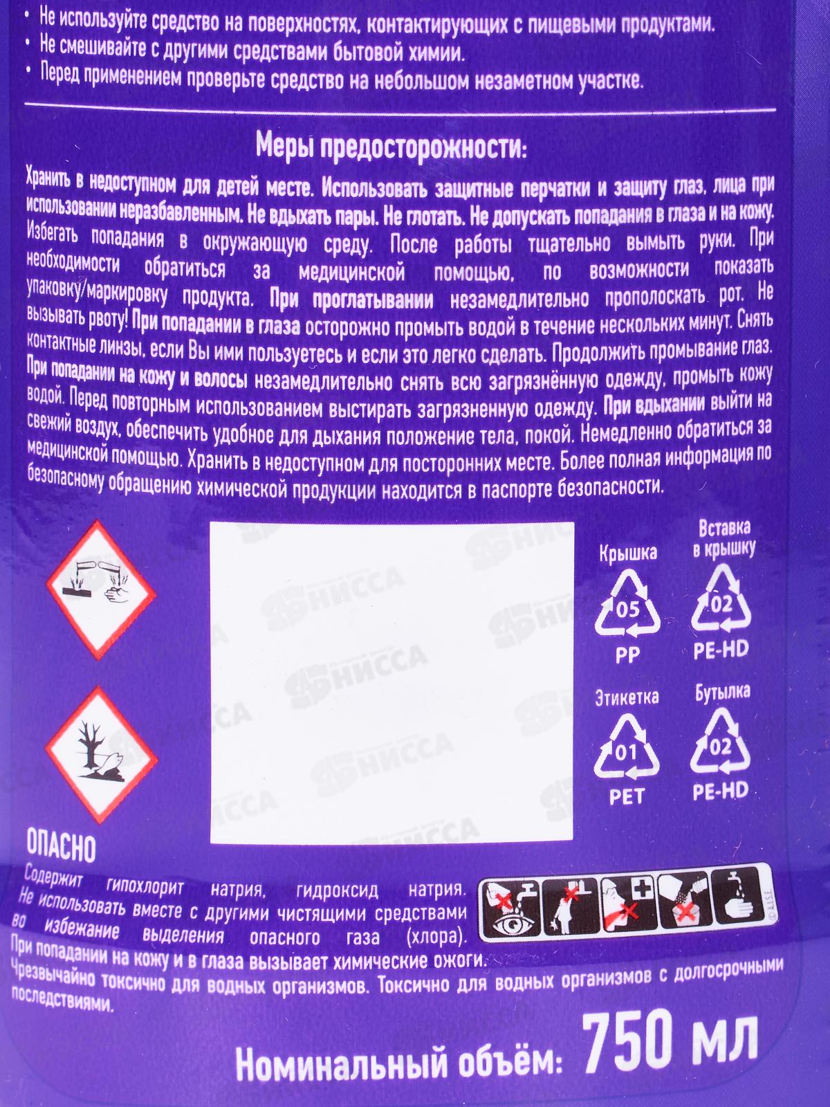 Состав: менее 5%: гипохлорит натрия, гидроксид натрия, анионные ПАВ, амфотерные ПАВ; 30% и более: вода.