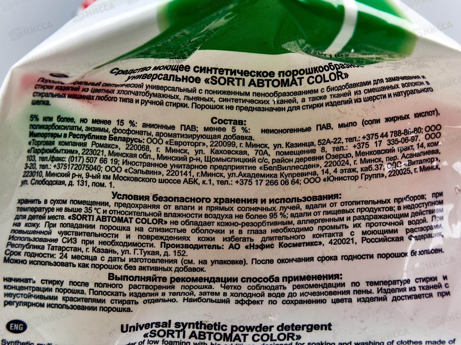 Состав: 5% или более, но менее 15%: анионные ПАВ, менее 5%: неионогенные ПАВ, мыло (соли жирных кислот), поликарбоксилаты, энзимы, фосфонаты, оптический отбеливатель, ароматизирующая добавка.