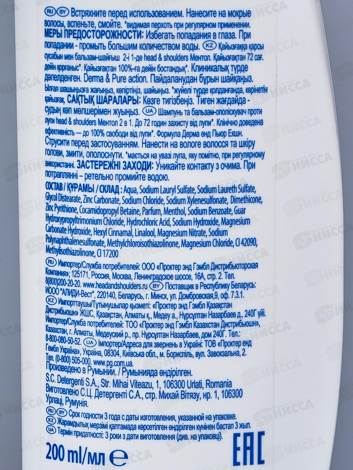 ХЭД ЭНД ШОЛД шампунь 2в1 200мл Освежающий ментол *6