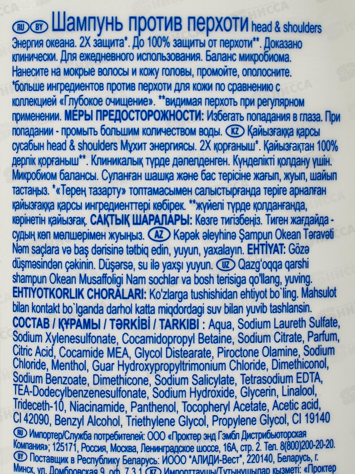 Состав: Вода, лаурилсульфат натрия, лауретсульфат натрия, гликоль дистеарат, карбонат цинка, хлорид натрия, ксилолсульфонат натрия, пиритион цинка, кокамидопропилбетаин, ароматизатор, диметикон, ментол, бензоат натрия, гуар гидроксипропилтримониум хлорид, соляная кислота, гидроксид натрия, гидроксид карбоната магния, линалоол, нитрат магния, полинафталинсульфонат натрия, метилхлоризотиазолинон, синий краситель (CI?42090), хлорид магния, жёлтый краситель (CI?19140), метилизотиазолинон.