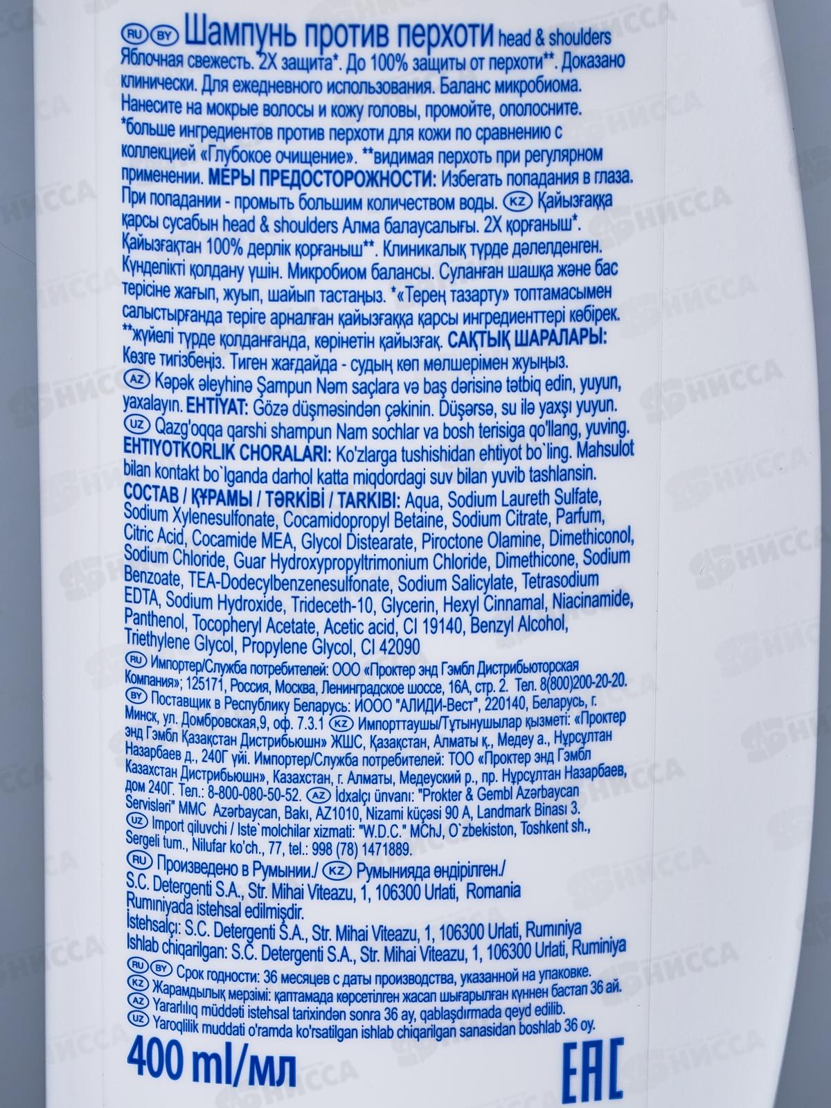 ХЭД ЭНД ШОЛД шампунь 400мл Яблочная свежесть *6