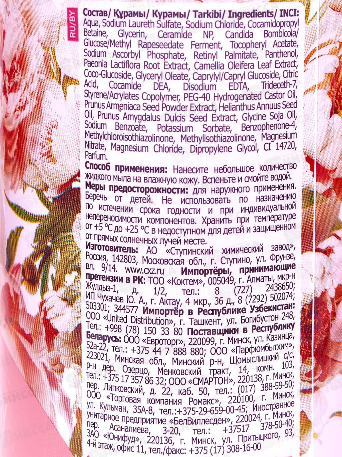 Состав: вода, лауретсульфат натрия, хлорид натрия, кокамидопропилбетаин, глицерин, церамид NP, фермент Candida Bombicola/глюкозы/метилрапсового сока, токоферилацетат, аскорбилфосфат натрия, ретинилпальмитат, пантенол, экстракт корня пиона молочноцветкового, экстракт листьев камелии масличной, кокоглюкозид, глицерил олеат, каприлил/каприл глюкозид, лимонная кислота, кокамид DEА, динатрий ЭДТА, тридецет-7, сополимер стирола/акрилатов, ПЭГ-40 гидрогенизированное касторовое масло, экстракт порошка семян абрикоса армянского, масло семян подсолнечника однолетнего, экстракт семян сладкого миндаля, масло сои глициновой кислоты, бензоат натрия, Сорбат калия, бензофенон-4, метилхлоризотиазолинон, метилизотиазолинон, нитрат магния, хлорид магния, дипропиленгликоль, CI 14720, парфюмерная композиция.