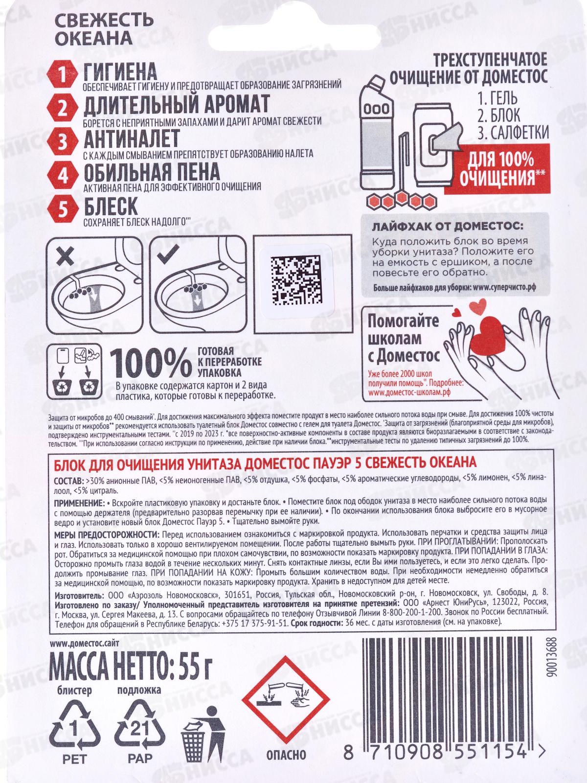 ДОМЕСТОС блок для унитаза Свежесть океана 55г *9