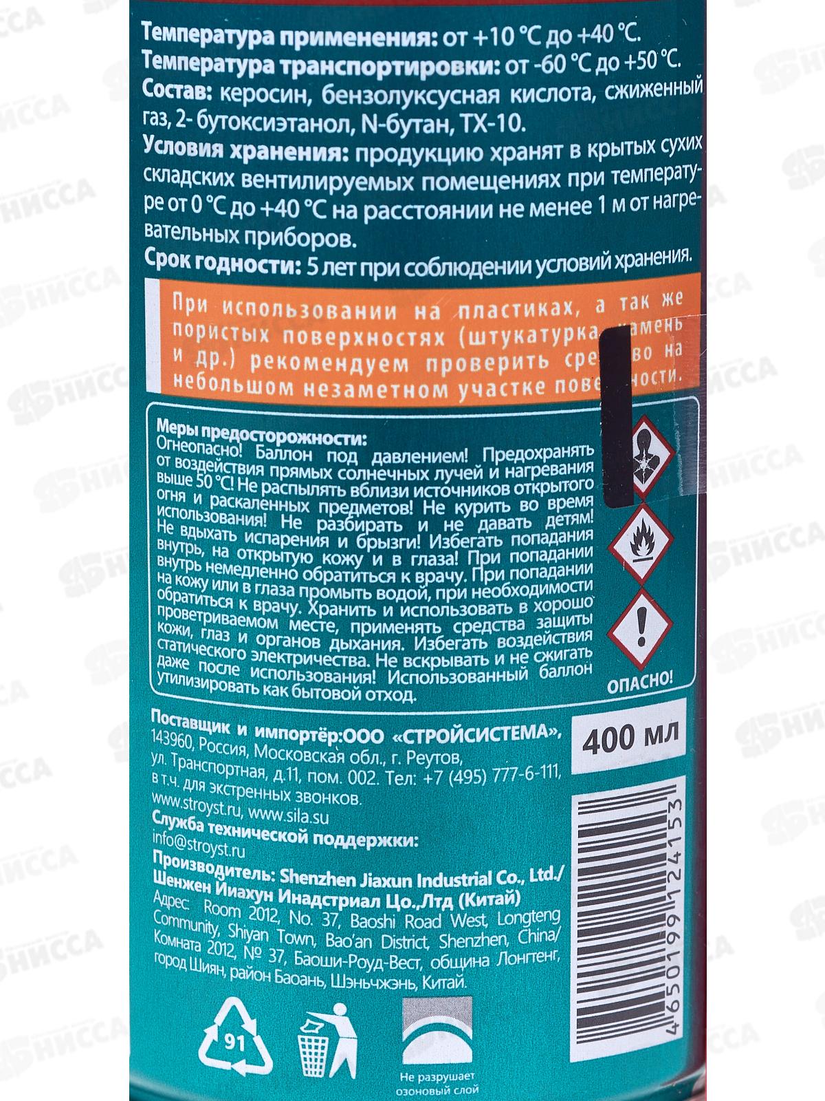 Эффективное удаление остатков клея, следов от этикеток, двухстороннего скотча. Состав: керосин, бензолуксусная кислота, сжиженный газ, 2-бутоксиэтанол, N-бутан, ТХ-10.