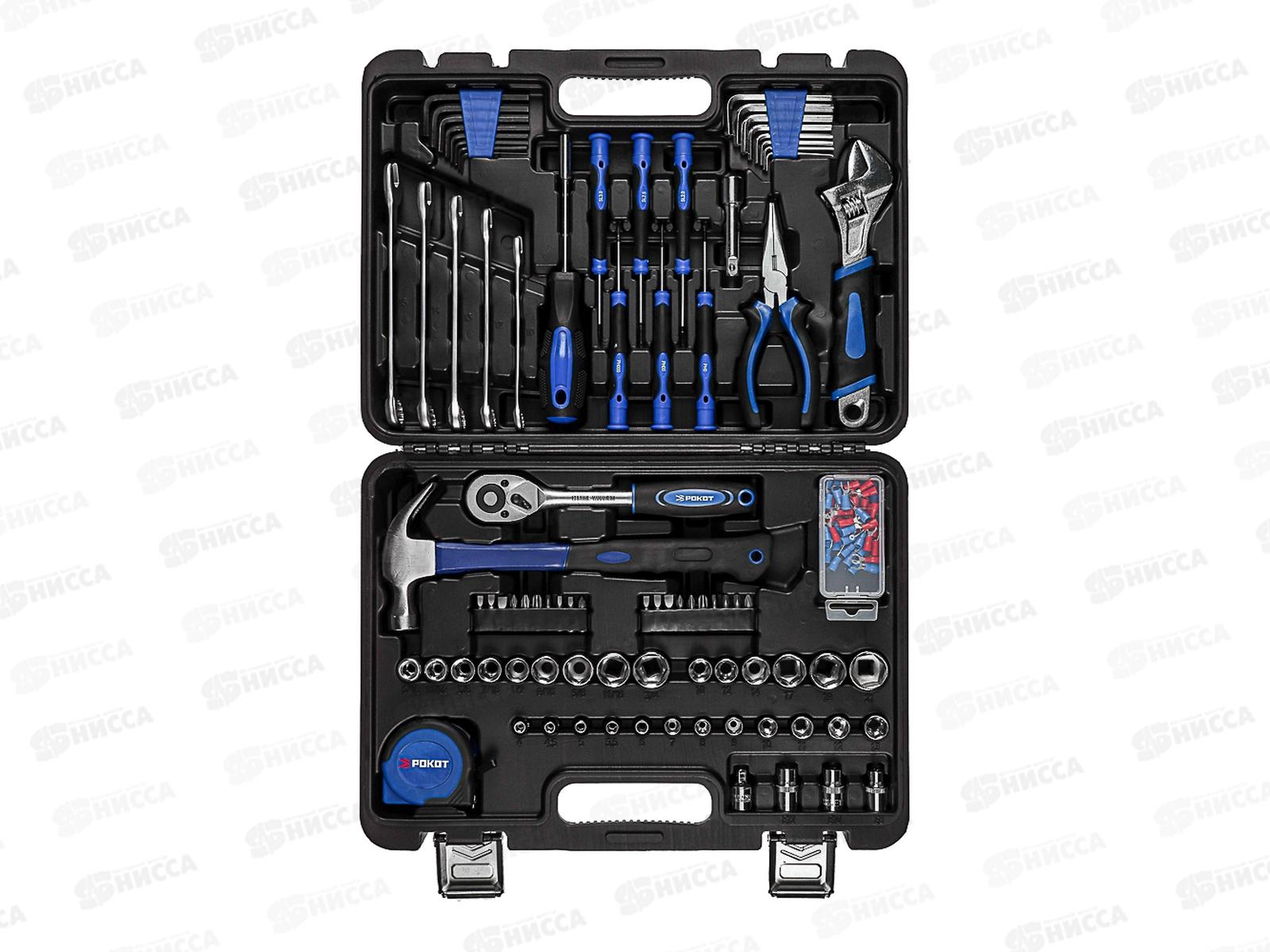 Набор инструмента РОКОТ из 128 предметов – это высококачественные инструменты из углеродистой стали для ремонта и монтажа. Могут использоваться для ремонта транспортных средств, а также для мелких работ по дому. В состав набора входят: 5 комбинированных ключей, 16 шестигранных ключей, 30 торцевых головок разных размеров и профилей, ключ-трещотка, биты, отвертка-удлинитель, разводной ключ, молоток, отвертки для точечных работ, плоскогубцы, рулетка, переходники, крепеж 43 шт. Каждый предмет в кейсе имеет свое место, что делает процесс использования максимально комфортным. Инструменты имеют большой запас прочности и износостойкости, поэтому прослужат долго.
