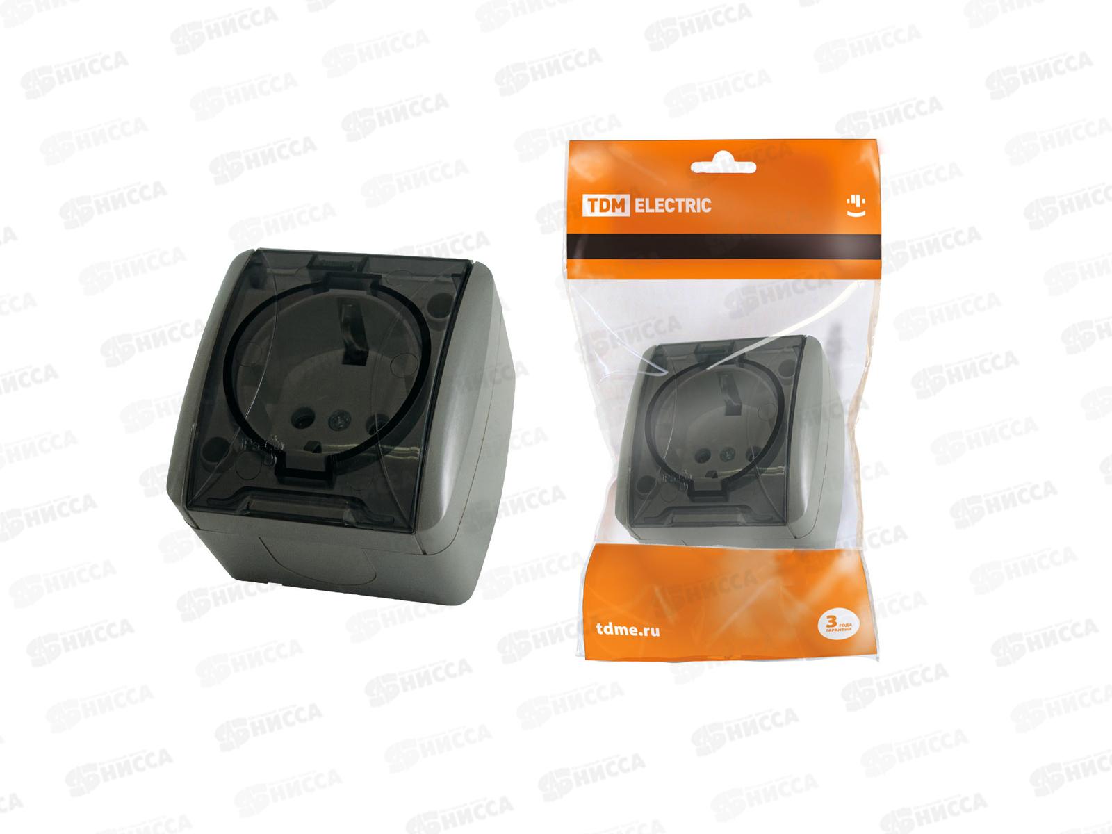 Розетка TDM открытая установка, IP54 16А с прозрачной крышкой, серая, "Селигер", 0107