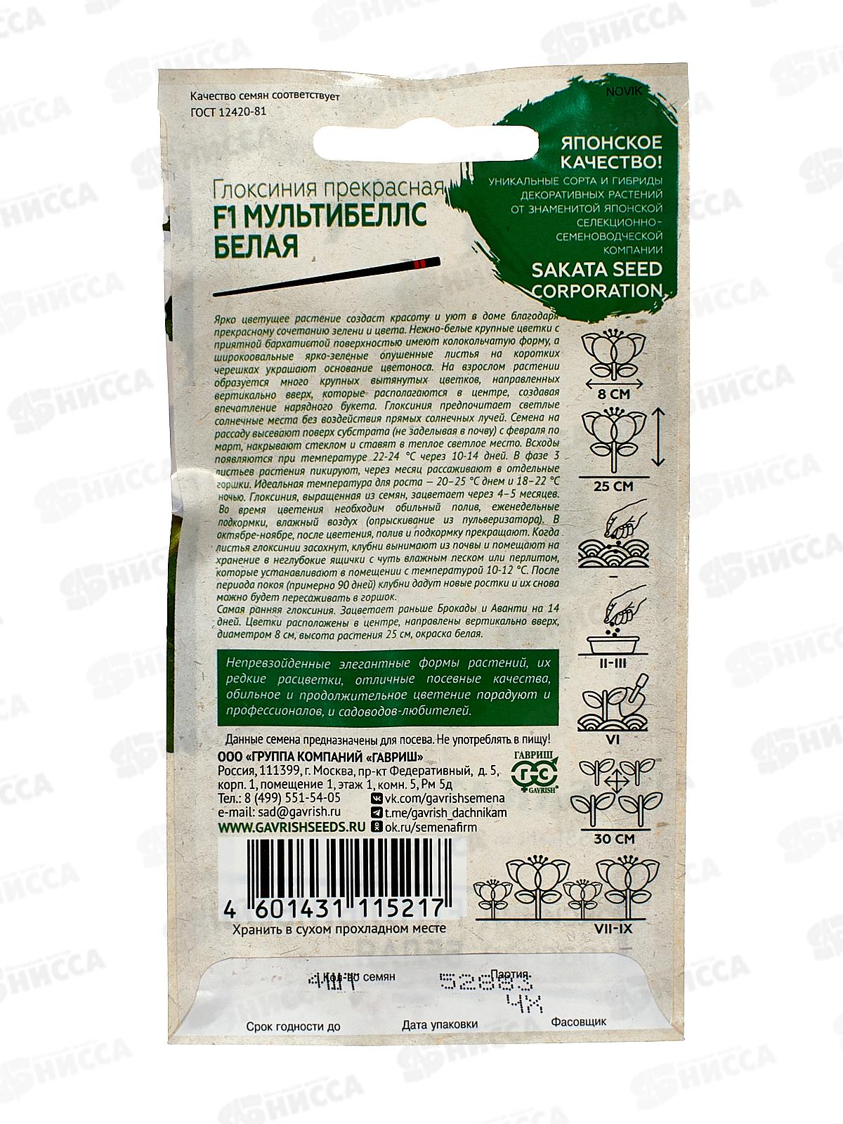 Глоксиния Мультибеллс белая F1 4шт гранул пробир Н22 *10 ГШ +