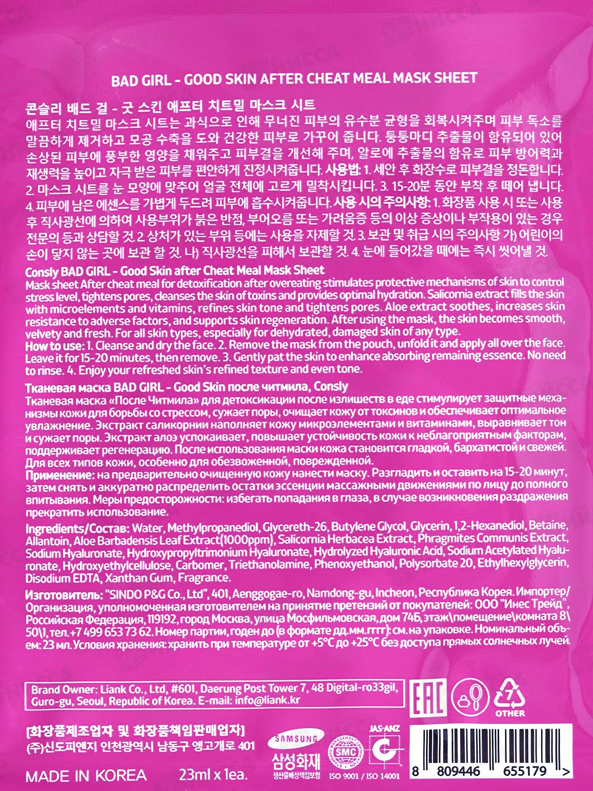 Consly Маска тканевая Bad Girl-Cold Skin после читмила 23мл