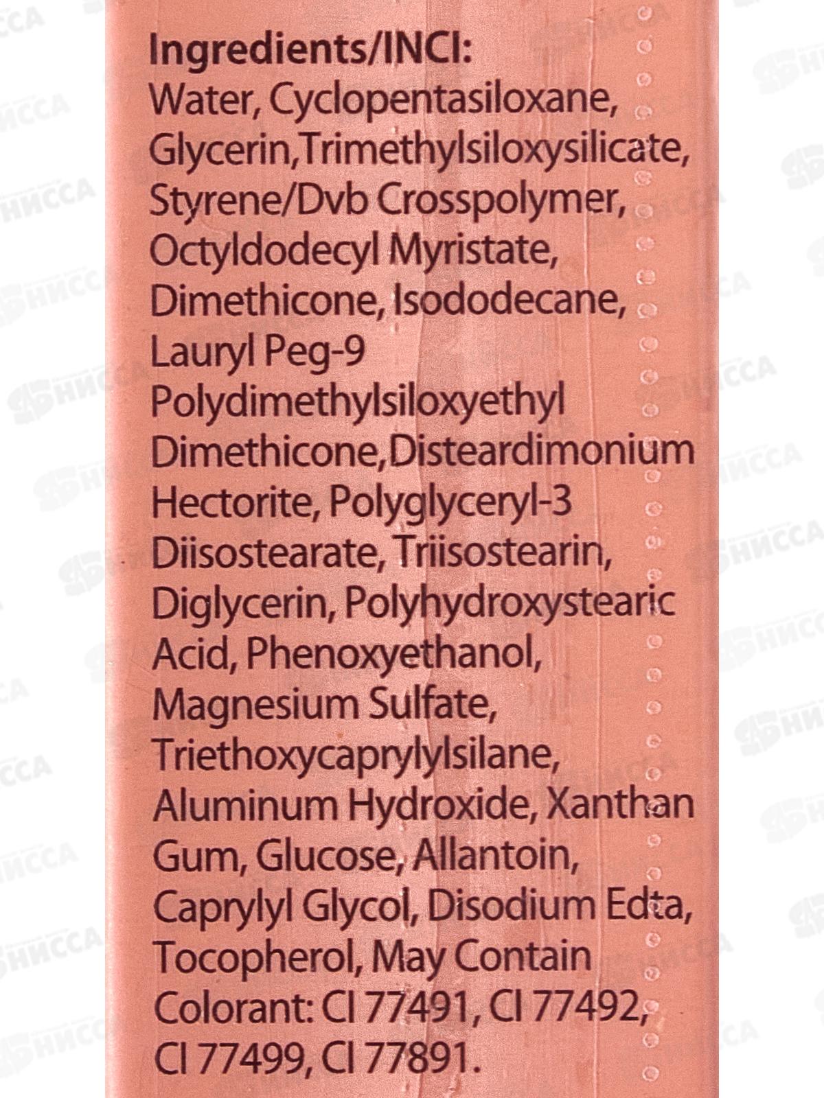 Состав: вода, Циклопентасилоксан, Глицерин, Триметилсилоксисиликат, Стирол/DVB кроссполимер; Октилдодецилмиристат, Диметикон, Изододекан; Лаурил ПЭГ-9, Полидиметилсилоксиэтилдиметикон, Дистеардимония гекторит; Полиглицерил-3-диизостеарат, Триизостеарин, Диглицерин, Полигидроксистеариновая кислота, Феноксиэтанол; Сульфат магния, Триэтоксикаприлилсилан, Гидроксид алюминия, Ксантановая камедь, Глюкоза, Аллантоин; Каприлилгликоль, Динатриевая соль ЭДТА, Токоферол. Может содержать красители: CI 77491, CI 77492, CI 77499; CI 77891.