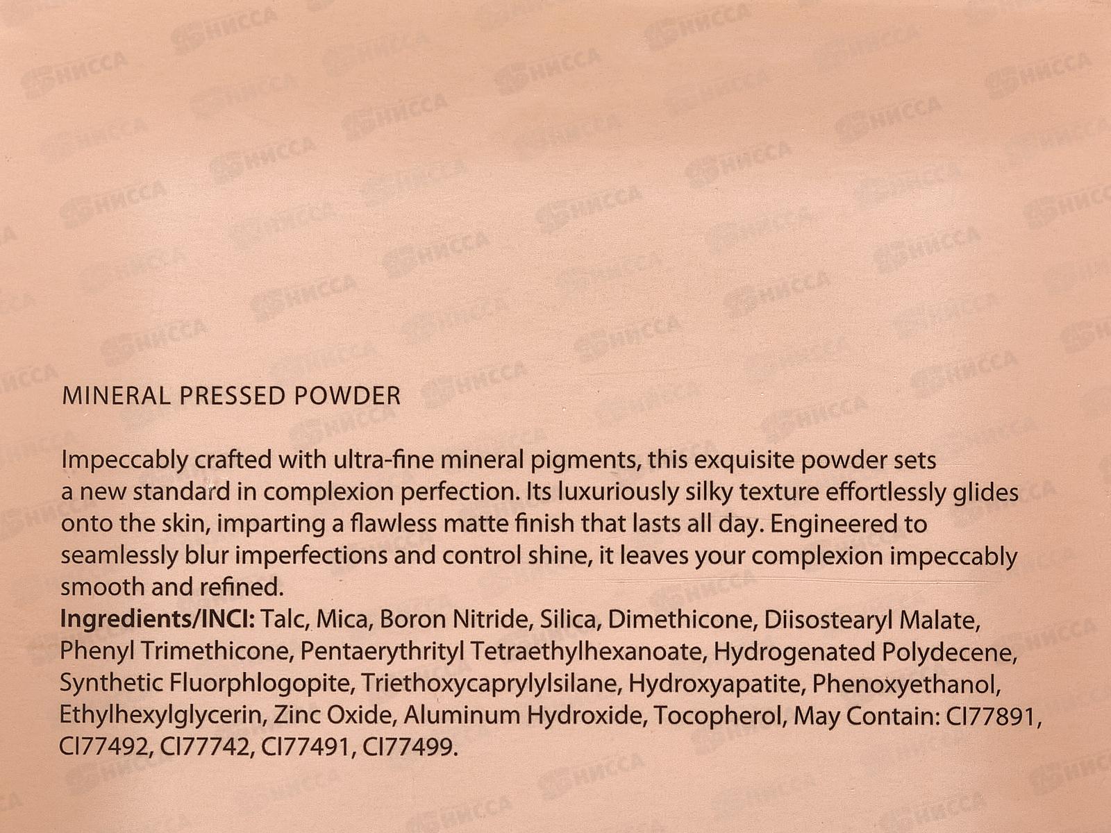 Состав: тальк, слюда, нитрид бора, диоксид кремния, диметикон, диизостеарилмалат, фенилтриметикон; пентаэритритилтетраэтилгексаноат, гидрогенизированный полидецен, синтетический фторфлогопит; триэтоксикаприлилсилан, гидроксиапатит, феноксиэтанол, этилгексилглицерин, оксид цинка; гидроксид алюминия, токоферол. Может содержать: Cl77891, CI77492, CI77742, CI77491, CI77499.