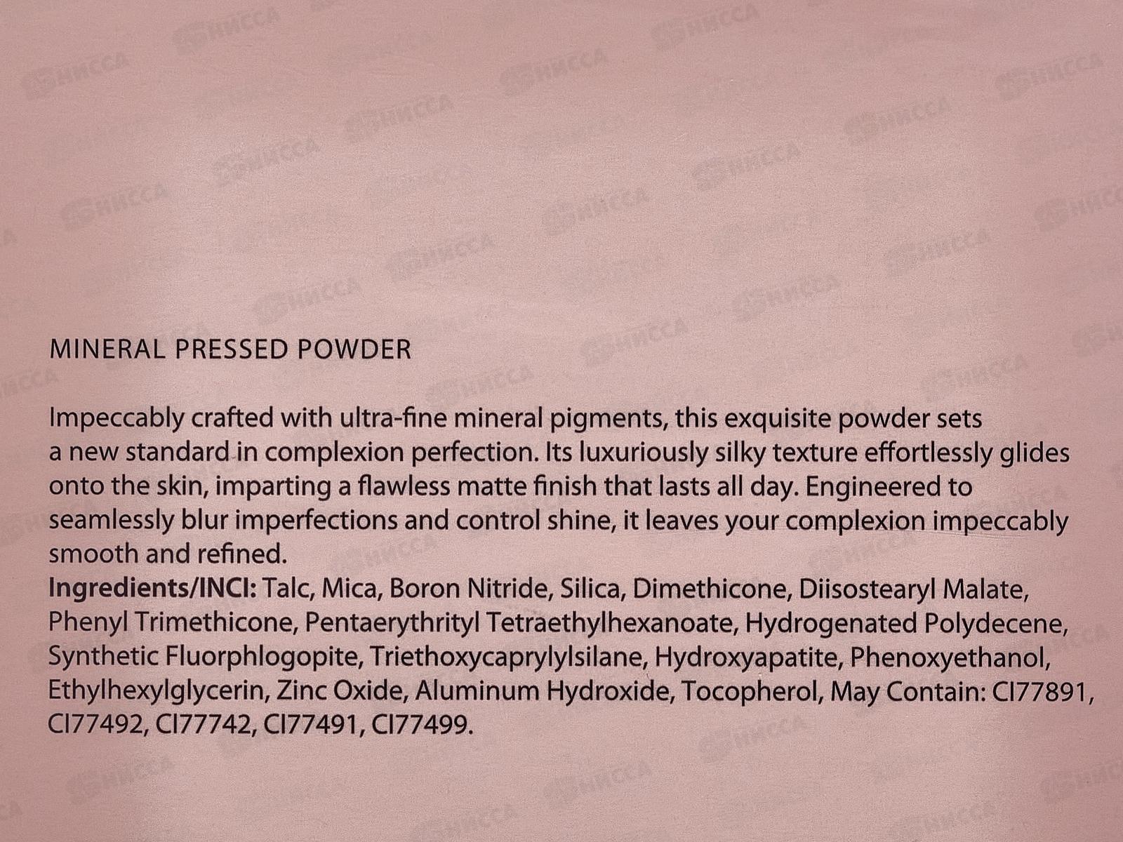 Состав: тальк, слюда, нитрид бора, диоксид кремния, диметикон, диизостеарилмалат, фенилтриметикон; пентаэритритилтетраэтилгексаноат, гидрогенизированный полидецен, синтетический фторфлогопит; триэтоксикаприлилсилан, гидроксиапатит, феноксиэтанол, этилгексилглицерин, оксид цинка; гидроксид алюминия, токоферол. Может содержать: Cl77891, CI77492, CI77742, CI77491, CI77499.