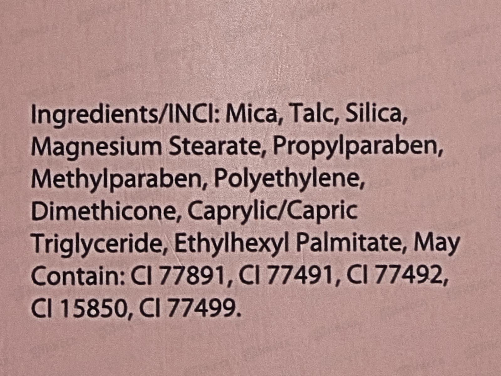 Состав: слюда, тальк, диоксид кремния, стеарат магния, пропилпарабен, метилпарабен, полиэтилен, диметикон; каприловый/каприновый триглицерид, этилгексилпальмитат. Может содержать: CI 77891, Cl 77491; CI 77492, CI 15850, Cl 77499.