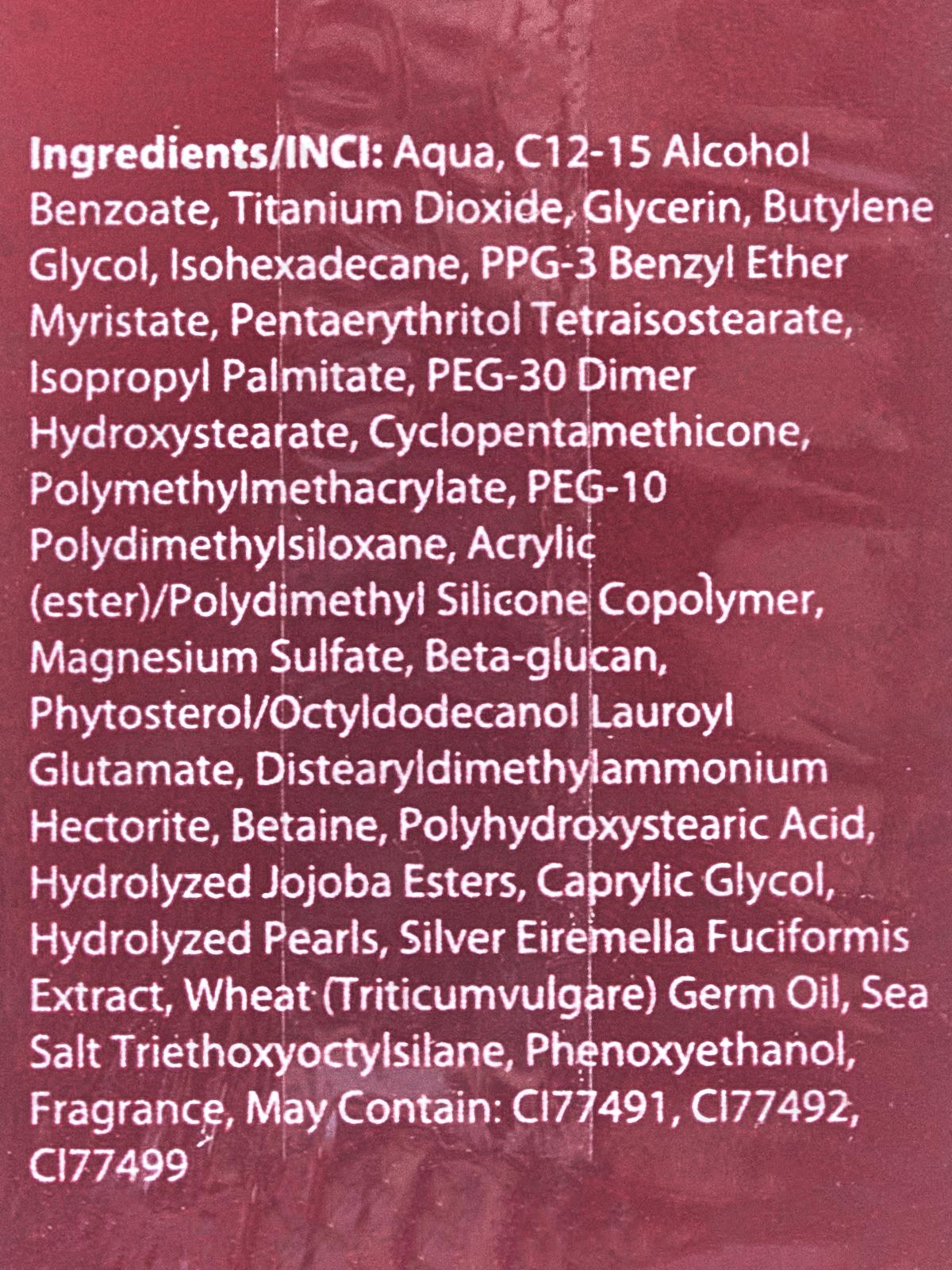 Состав: Тальк, слюда, нитрид бора, диоксид кремния, диметикон, диизостеарил малат, фенилтриметикон, пентаэритритил тетраэтилгексаноат, гидрогенизированный полидецен, синтетический флуорфлогопит, триэтоксикаприлилсилан, гидроксиапатит, феноксиэтанол, этилгексилглицерин, оксид цинка, гидроксид алюминия, токоферол. Может содержать: CI?77891, CI?77492, CI?77742, CI?77491, CI?77499.