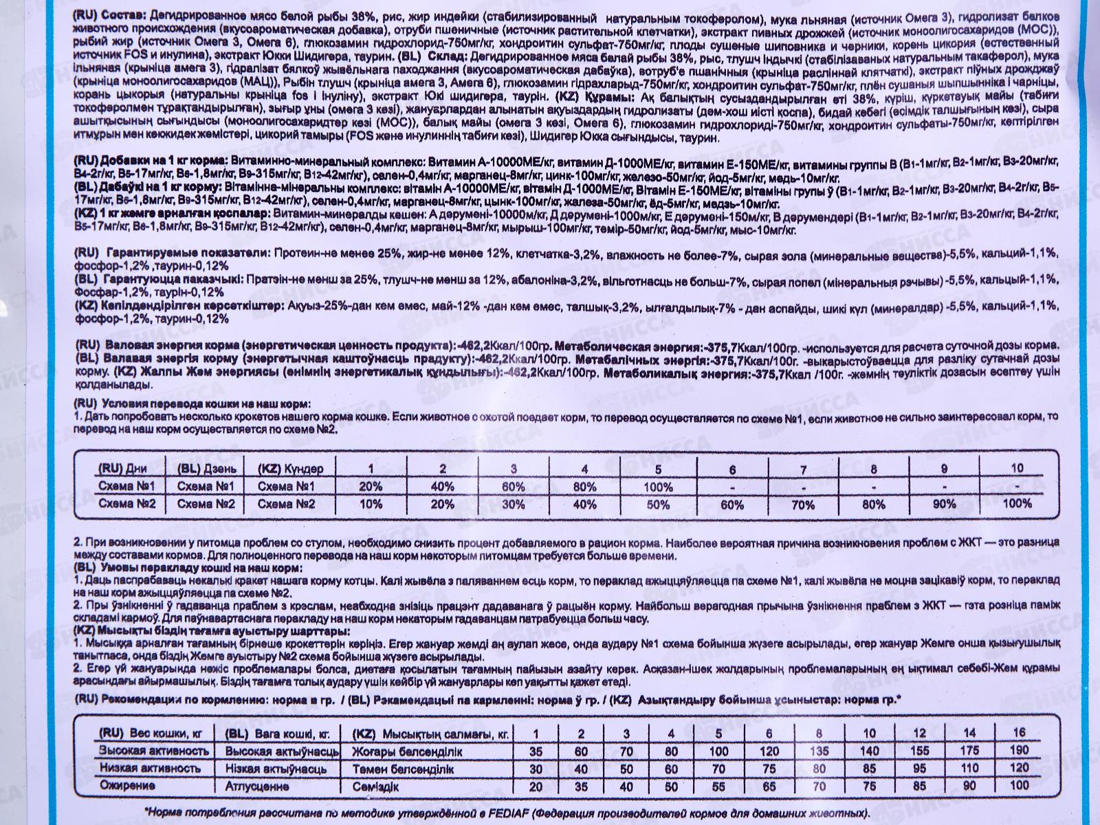 Состав: рыба дегидрирования 38%, рисовая мука, льняная мука (источник Омега 3, Омега 6), отруби пшеничные (источник растительной клетчатки), жир индейки, натуральная вкусо-ароматическая добавка животного происхождения, мел, монокальцийфосфат, МОС, таурин, хондроитин, глюкозамин, L-карнитин, рыбий жир, экстракт юкки шидигера, черника, метионин, шиповник, корень цикория, яблоки, морковь, клюква. Гарантируемые показатели: протеин 32%, жир 14%, Омега-3 и Омега-6 2%, клетчатка 3%, влажность 7%, сырая зола 8%, кальций 1,6%, фосфор 1,1%, таурин 0,1%.