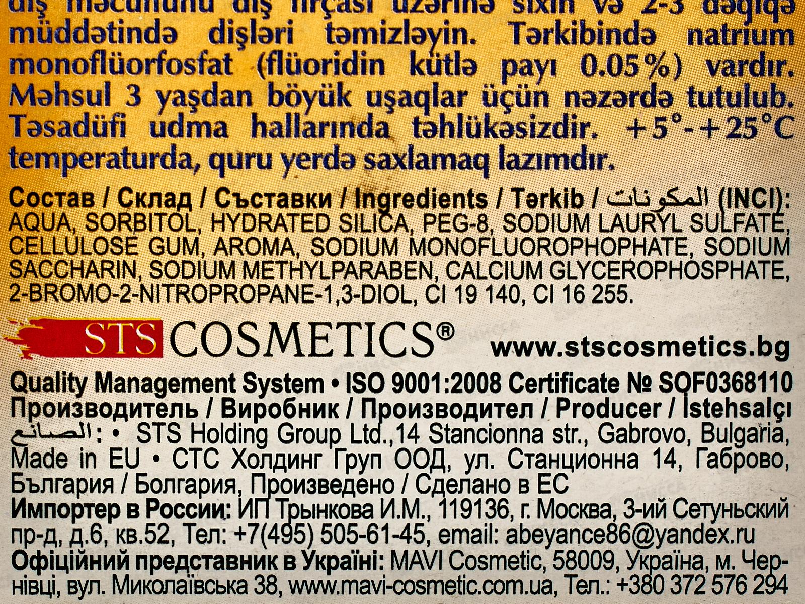 Детская зубная паста со вкусом апельсина. Эффективно очищает детские зубы, укрепляет эмаль и защищает от кариеса, а вкус апельсина доставляет детям истинное удовольствие. Состав: ВОДА, СОРБИТ, ГИДРАТИРОВАННЫЙ ДИОКСИД КРЕМНИЯ, ПЭГ-8, ЛАУРИЛСУЛЬФАТ НАТРИЯ, ЦЕЛЛЮЛОЗНАЯ КАМЕДЬ, ароматизатор, МОНОФТОРФОФАТ НАТРИЯ, САХАРИН НАТРИЯ, МЕТИЛПАРАБЕН НАТРИЯ, ГЛИЦЕРОФОСФАТ КАЛЬЦИЯ, 2-БРОМ-2-НИТРОПРОПАН-1, 3-ДИОЛ, CI 19 140, CI 16 255.