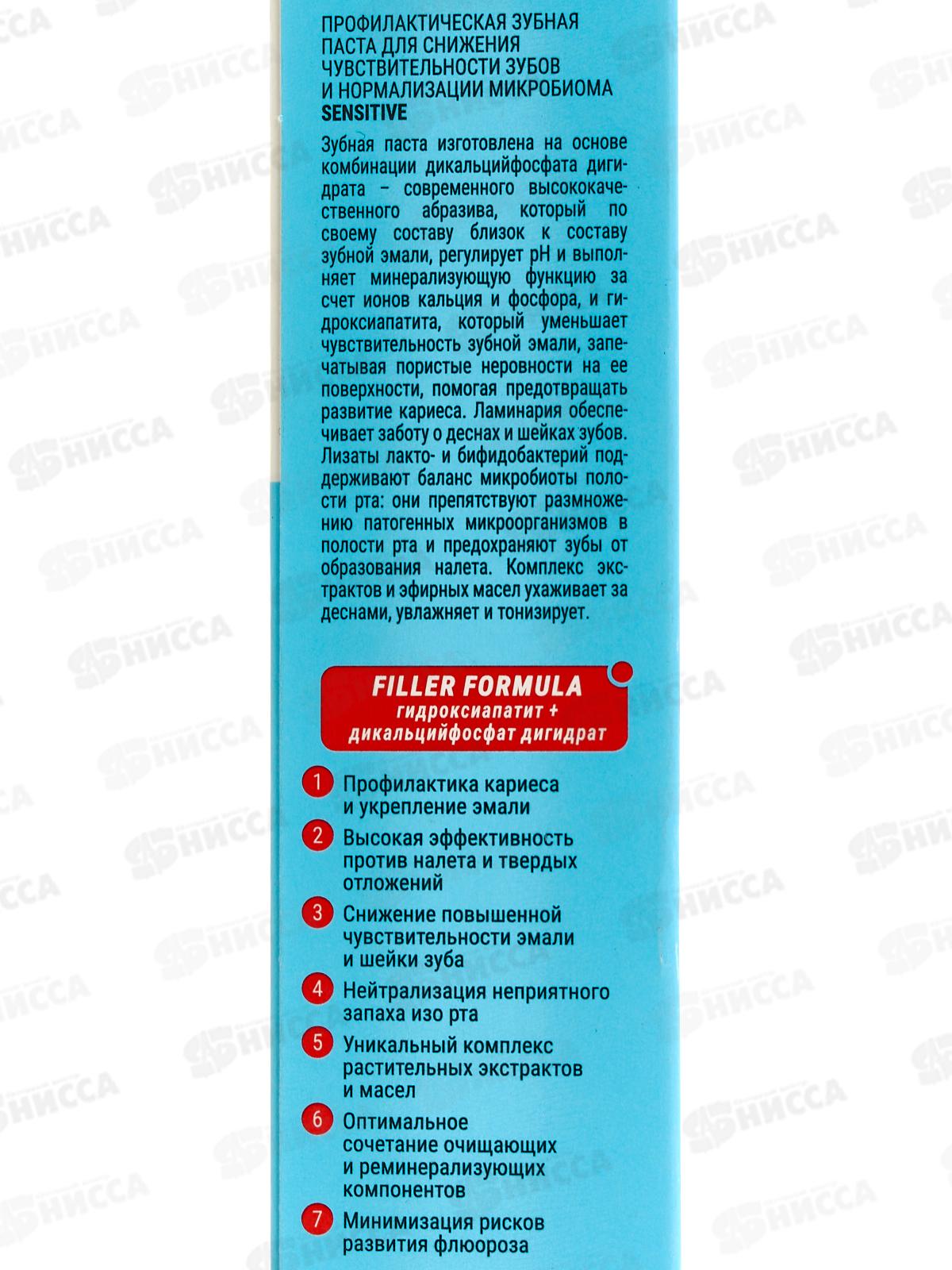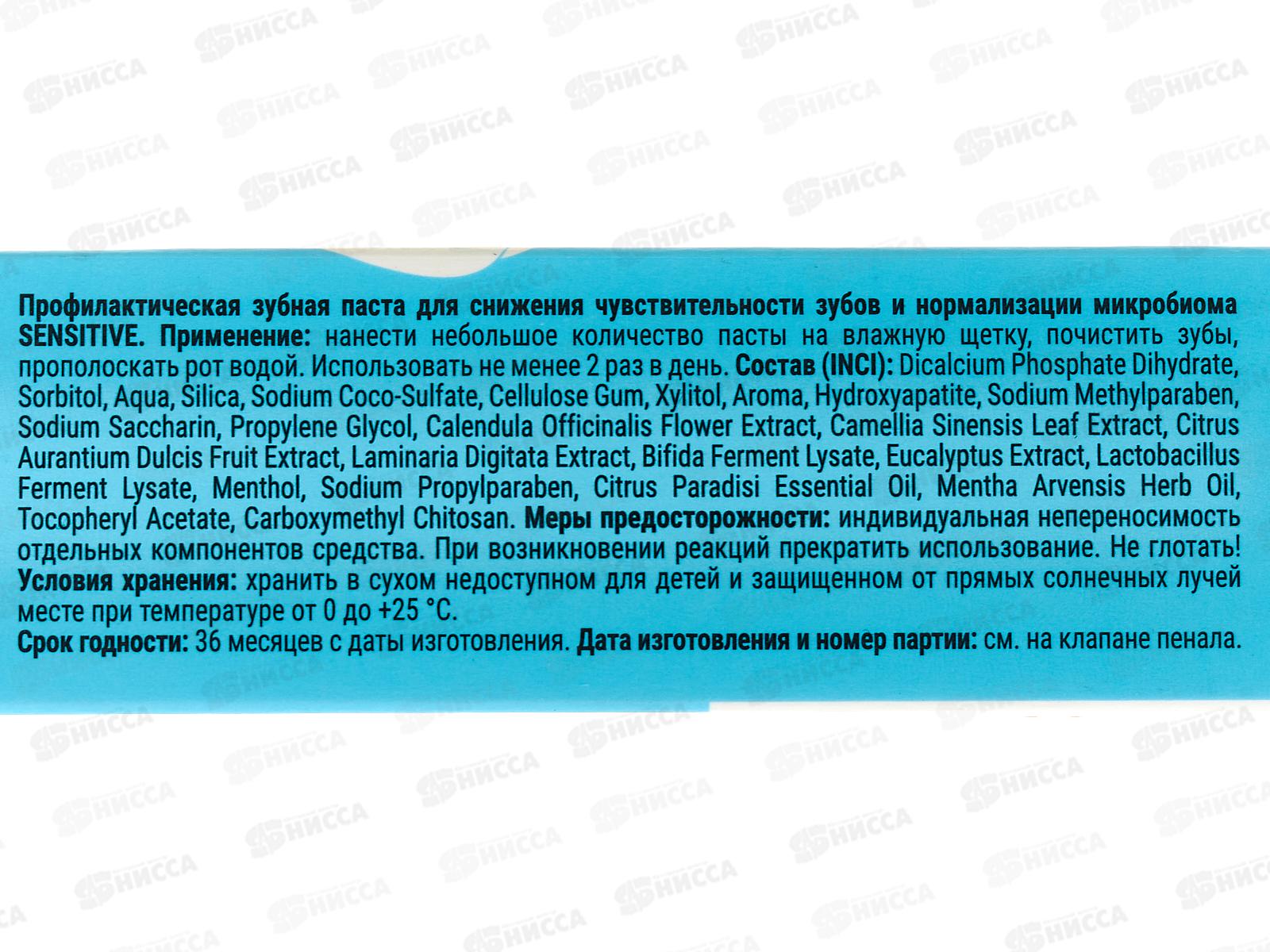Состав: дигидрат фосфата кальция двузамещённого; сорбитол (сорбитовый спирт); вода; диоксид кремния; кокосульфат натрия; целлюлозная камедь (карбоксиметилцеллюлоза); ксилитол (ксилит); ароматизатор; гидроксиапатит; метилпарабен натрия (натриевая соль метилпарабена); сахарин натрия; пропиленгликоль; экстракт цветков календулы лекарственной; экстракт листьев камелии китайской (зелёного чая); экстракт плодов апельсина сладкого; экстракт ламинарии пальчато рассечённой; лизат фермента бифидобактерий; экстракт эвкалипта; лизат фермента лактобактерий; ментол; пропилпарабен натрия (натриевая соль пропилпарабена); эфирное масло грейпфрута; масло травы мяты полевой; ацетат токоферола (витамин?E); карбоксиметилхитозан.