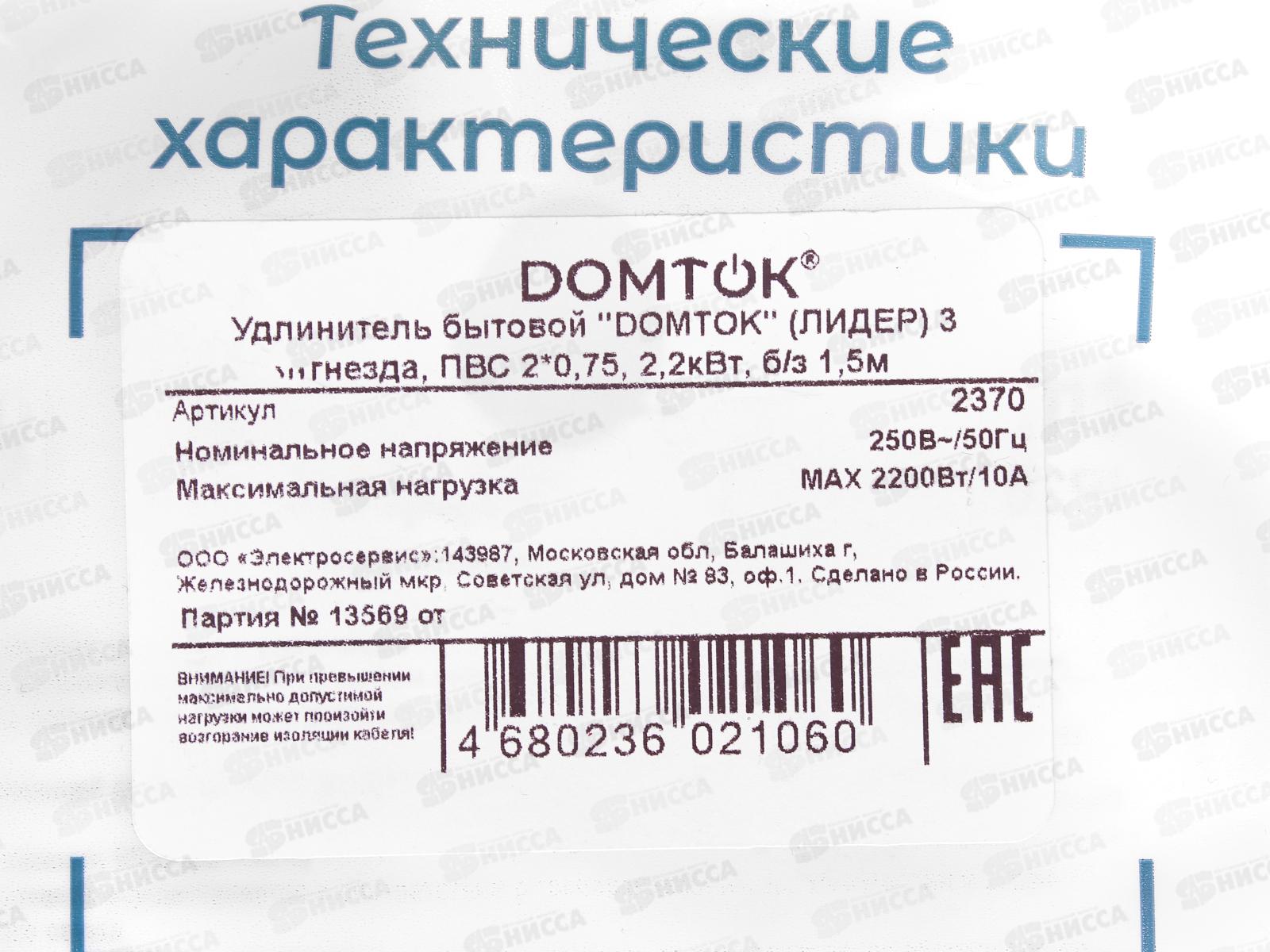 Удлинитель бытовой DOMTOK 2,2кВТ 3гн. ПВС 2*0,75, б/з, 1,5 м, 2370