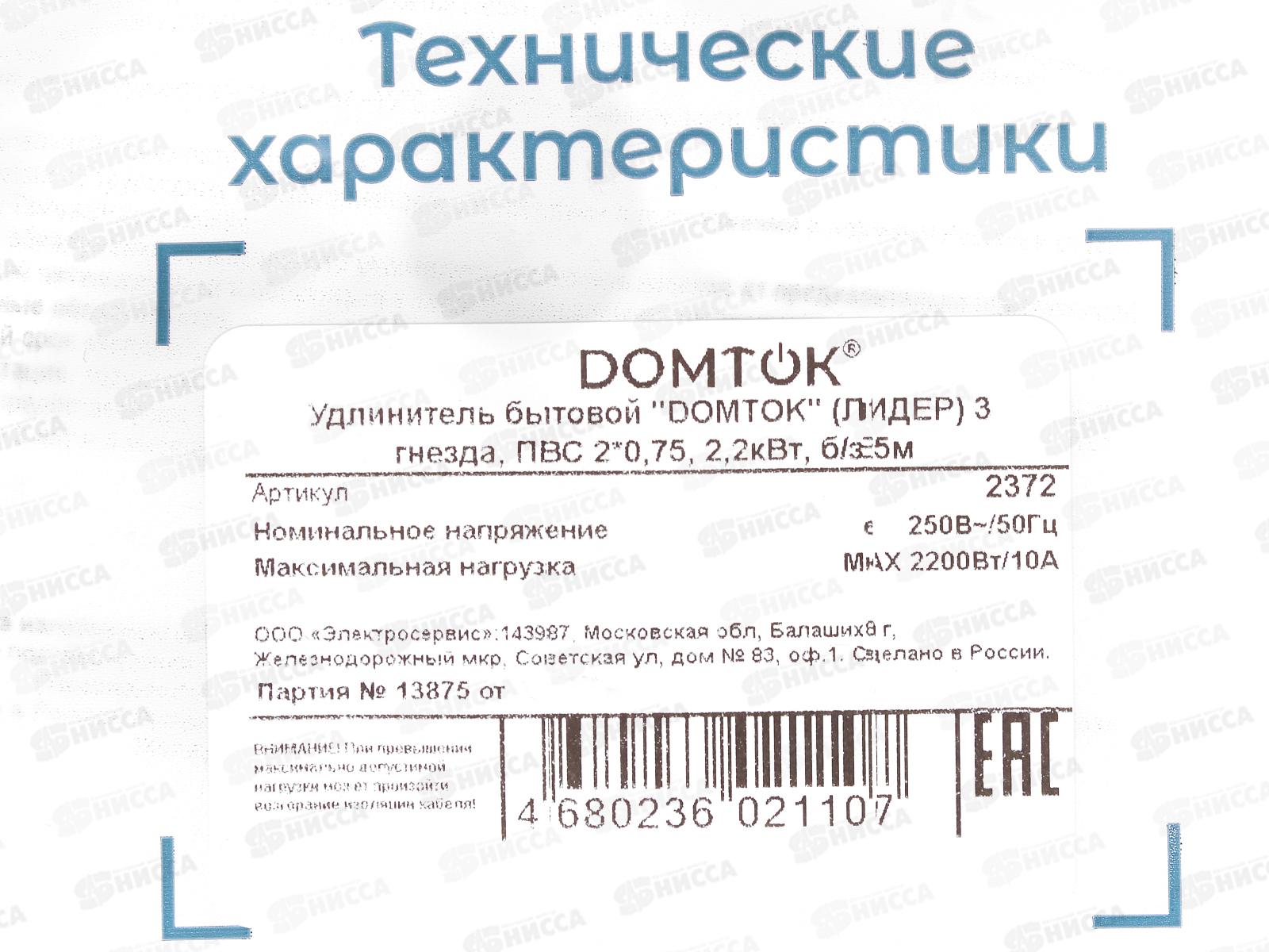 Удлинитель бытовой DOMTOK 2,2кВТ 3гн. ПВС 2*0,75, б/з, 5м, 2372