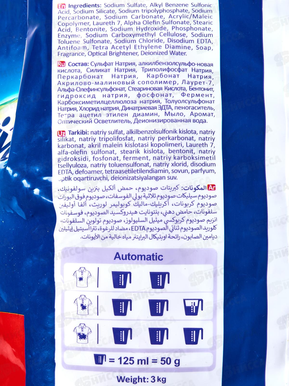 Стиральный порошок автомат универсальный "Poly Wash". С кислородным пятновыводителем и оптическим отбеливателем для всех видов ткани. Polymer Enzyme-технология холодной стирки. Средство с пониженным пенообразованием. Обеспечивает исключительное очищение, даже при стирке в холодной воде. Дарит вещам свежий аромат. Полностью выполаскивается водой. Состав: сульфат натрия, алкилбензолсульфоновая кислота, силикат Натрия, триполифосфат натрия, перкарбонат натрия, карбонат натрия, акрилово-малеиновый сополимер, лаурет7 -, альфаОлефинсуль-фонат, стеариновая кислота, бентонит, гидроксид натрия, фосфонат, фермент, карбоксиметилцелл-ипозанатоил, толуолсульфонат натрия, хлорид натрия, динатриевая ЭДТА, пеногаситель, тетраацетилэтилендиамин, мыло, аромат, оптический осветлитель, деионизированная вода.