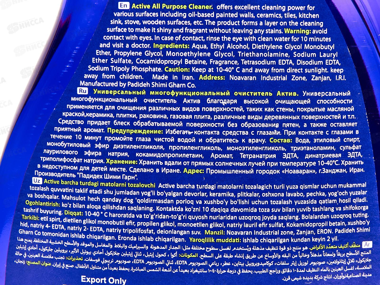 Универсальное средство для уборки дома. Active. Обладает высокой очищающей способностью. Эффективно удаляет повседневные загрязнения, масложировые пятна, пыль и налет. Подходит для различных поверхностей, кафельной плитки, сантехники, стеклянных, никелированных. Может использоваться для очистки дерева и тканей. Антибактериальный и антистатический эффект. Нейтрализует неприятный запах и обладает ароматизирующим эффектом «Весенние цветы». Состав: вода, этиловый спирт, монобутиловый эфир диэтиленгликоля, пропиленгликоль, моноэтиленгликоль, триэтаноламин, сульфат лаурилового эфира натрия, кокамидопропилетаин, аромат, тетранатрия ЭДТА, динатриевая ЭДТА, триполифосфат натрия.