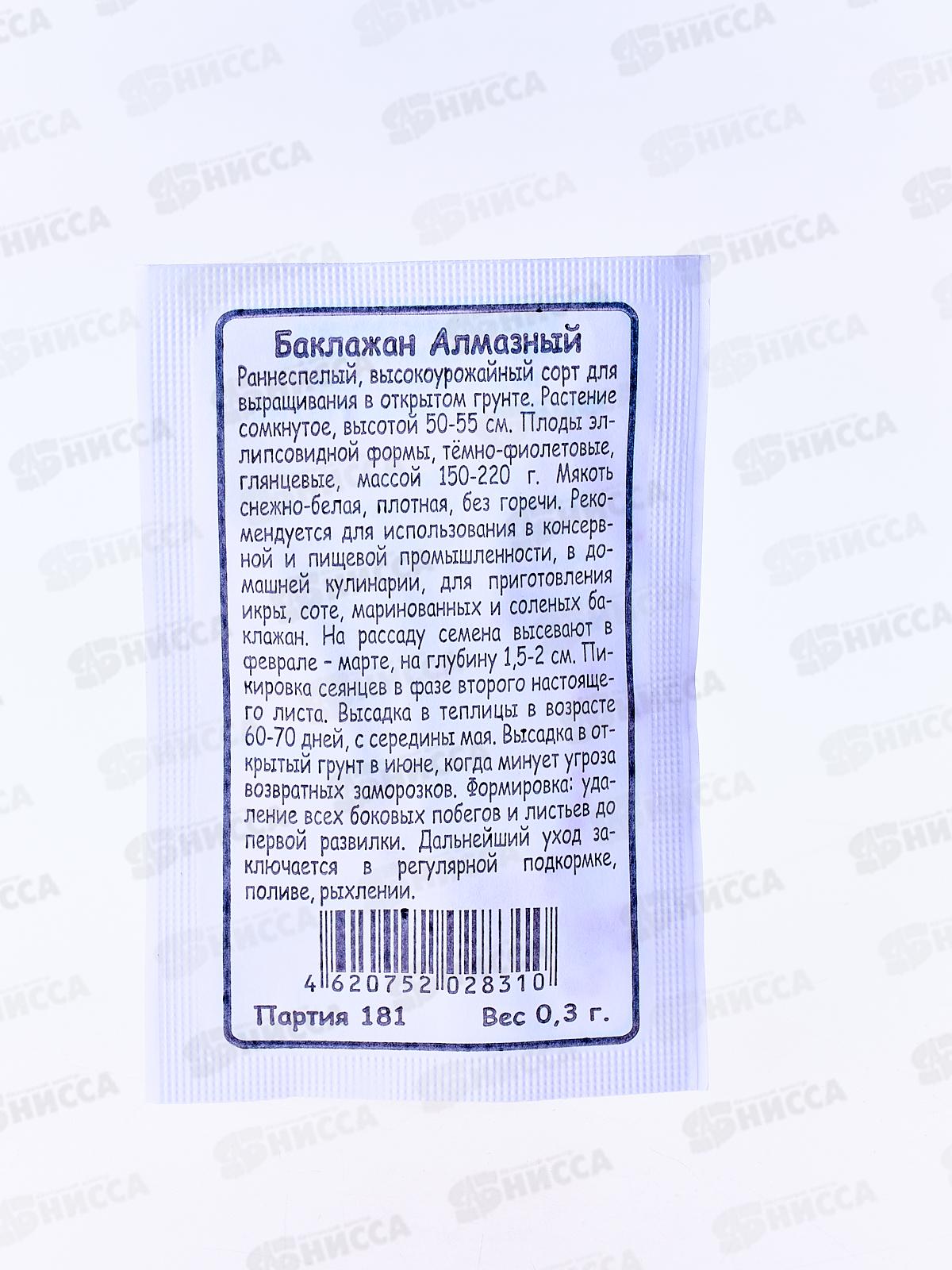 Раннеспелый, высокоурожайный сорт для выращивания в открытом грунте. Растение сомкнутое, высотой 50-55 см. Плоды эллипсовидной формы, тёмно-фиолетовые, глянцевые, массой 150-220 г. Мякоть снежно-белая, плотная, без горечи. Шипы на чашечке отсутствуют или редкие. Рекомендуется для использования в консервной и пищевой промышленности, в домашней кулинарии, для приготовления икры, соте, маринованных и соленых баклажан. Культура теплолюбива, требовательна к свету и влаге. На рассаду семена высевают в феврале – марте, на глубину 1,5-2 см. Пикировка сеянцев в фазе второго настоящего листа. Высадка в теплицы в возрасте 60-70 дней, с середины мая. Высадка в открытый грунт в июне, когда минует угроза возвратных заморозков. Формировка: удаление всех боковых побегов и листьев до первой развилки. К концу июля на растении оставляют 5-6 самых крупных завязей, другие цветы и завязи удаляют. Дальнейший уход заключается в регулярной подкормке, поливе, рыхлении.
