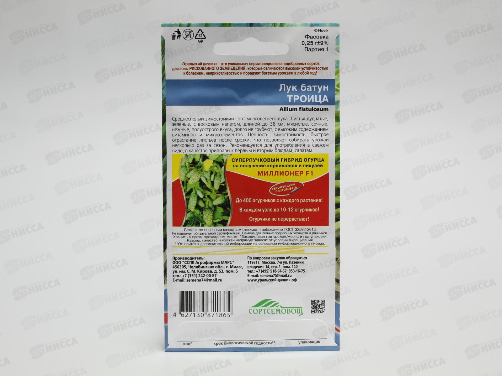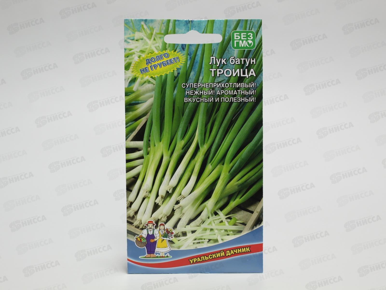 Лук батун Троица - среднеспелый, зимостойкий сорт многолетнего лука. Листья дудчатые, зелёные, с восковым налётом, длиной до 38 см, мясистые, сочные, нежные, полуострого вкуса, долго не грубеют, с высоким содержанием витаминов и микроэлементов. Ценность сорта: зимостойкость, быстрое отрастание листьев после срезки, что позволяет собирать урожай несколько раз за сезон. Рекомендуется для употребления в свежем виде, в качестве приправы к первым и вторым блюдам, салатам. Посев в апреле - мае в грунт (можно под зиму). Сеют на глубину 0,5-1 см по схеме 5x20 см. Рекомендуется проводить регулярное рыхление междурядий и прополку; для получения более раннего урожая возможно выращивание через рассаду (20 дней). Растение многолетнее, на одном месте растет 5-6 лет. Весной быстро отрастает и дает раннюю зелень уже в апреле. Не требует укрытия на зиму, так как отличается высокой морозостойкостью.