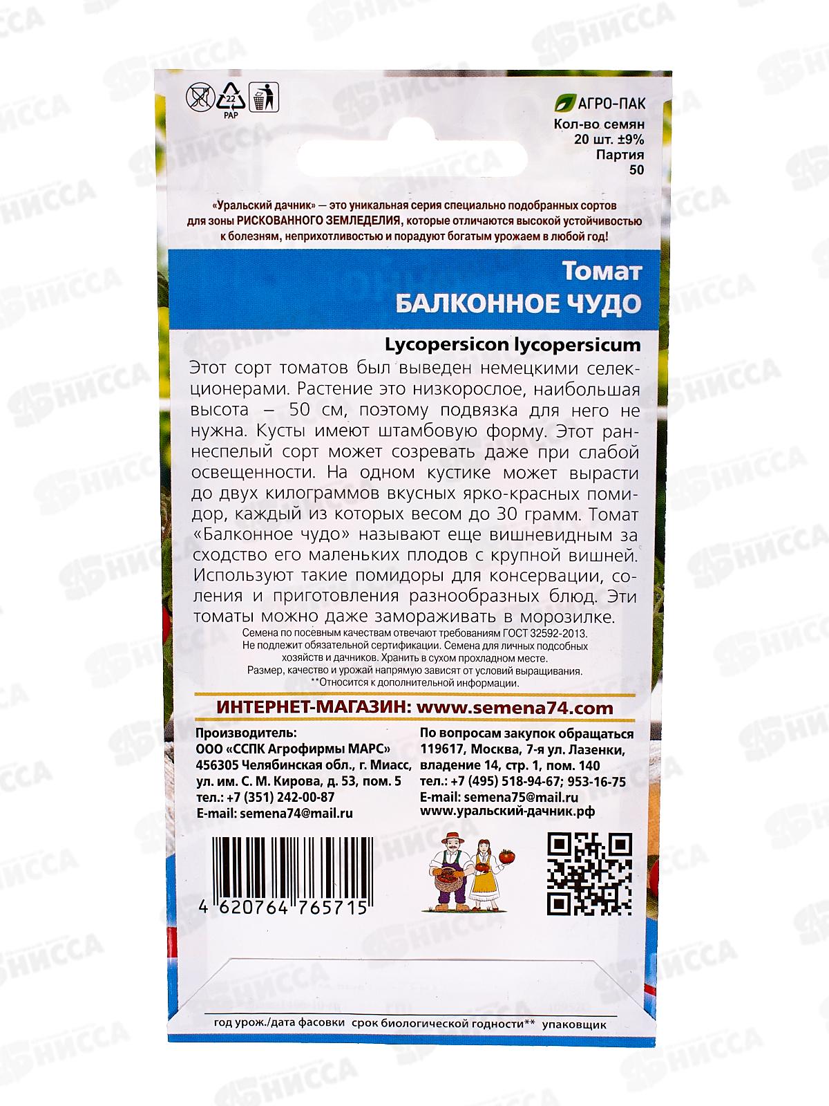 Томат БАЛКОННОЕ ЧУДО — Круглогодичный! На новогодний стол свежие помидорки со своего подоконника! На новогодний стол свежие помидорки – со своего подоконника! Скороспелый. Плоды округлые, красные, массой 15-20 г, очень вкусные и сладкие, идеальны для засолки. Не требует пасынкования. На рассаду семена высевают в марте, на глубину 2-3 см, при температуре 23-25 °C. После появления всходов, в течении 5-7 суток, температуру поддерживают на уровне 15-16 °C, затем повышают до 20-22 °C. Пикировка в фазе 1-2 настоящих листьев. В теплицы 60-65 дневную рассаду высаживают в апреле-мае, в открытый грунт – в июне, после окончания весенних заморозков, в фазе 6-7 настоящих листьев и хотя бы одной цветочной кисти. Схема посадки 30 х 50 см. Томаты нуждаются в регулярных поливах и подкормках.