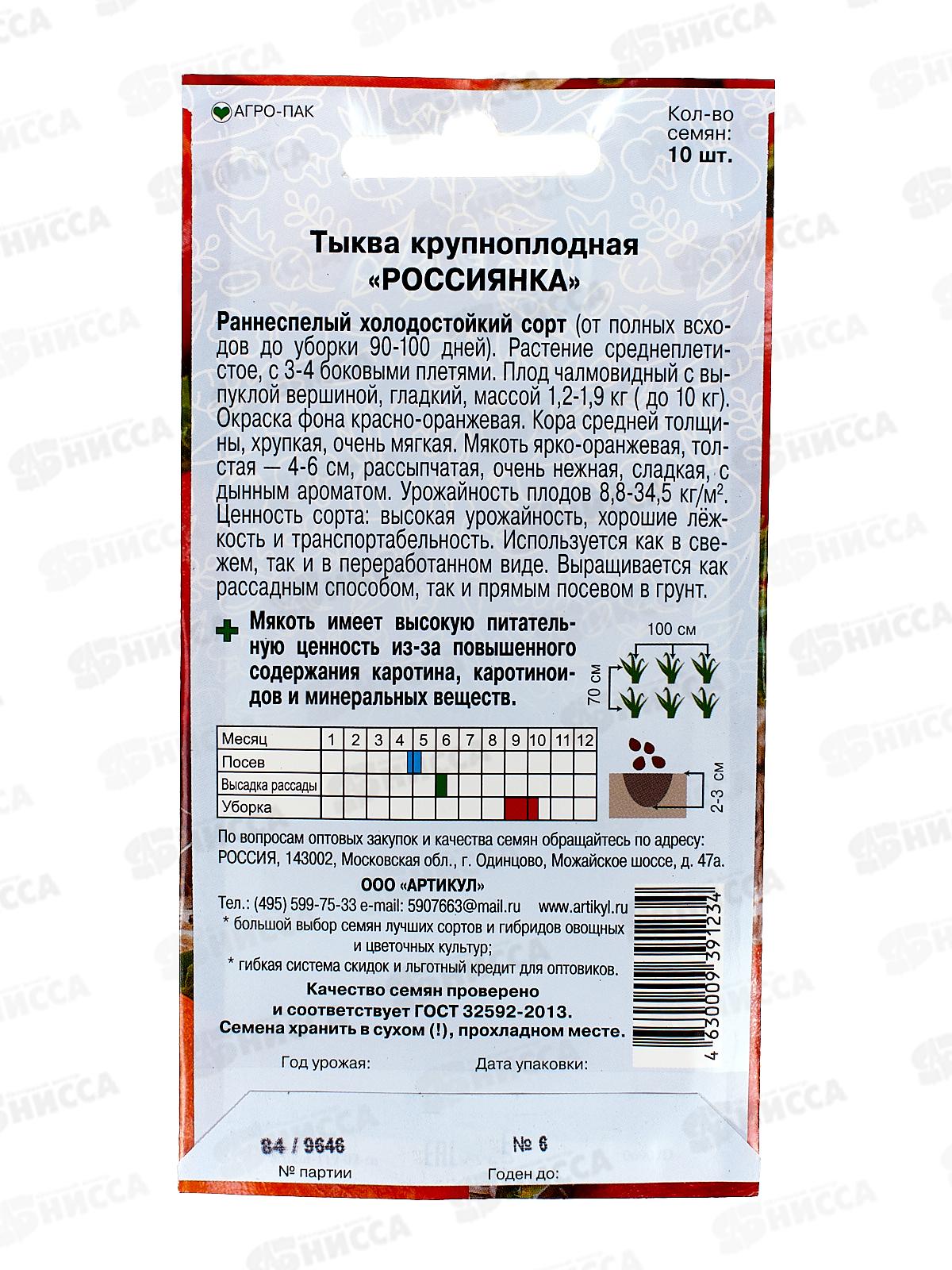 Тыква Россиянка крупноплодная 10шт цв/п *10 АРТ +