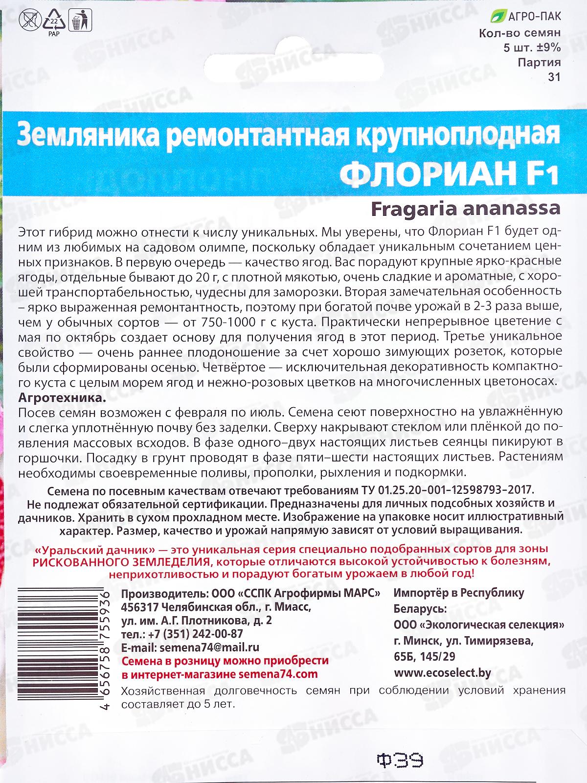 Земляника Флориан ремонтантная F1 Евро *10 УрД +