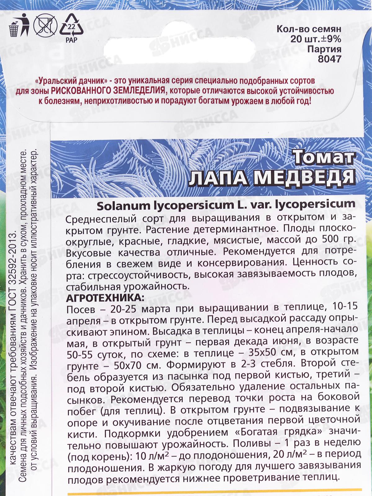 Сахаристая мякоть, отменный вкус, рекордная урожайность! Низкорослый куст с тяжёлыми, мощными плодами, массой до 500 г, поражает воображение. Великолепный крупноплодный сорт для открытого грунта, без пасынкования! Плоды плоско-округлые, красные, гладкие, мясистые, очень вкусные и сочные. На рассаду семена высевают в марте, на глубину 2-3 см, при температуре 23-25 °C. После появления всходов, в течении 5-7 суток, температуру поддерживают на уровне 15-16 °C, затем повышают до 20-22 °C. Пикировка в фазе 1-2 настоящих листьев. В теплицы 60-65 дневную рассаду высаживают в апреле - мае, в открытый грунт - в июне, после окончания весенних заморозков, в фазе 6-7 настоящих листьев и хотя бы одной цветочной кисти. Схема посадки 30 х 50 см. Томаты нуждаются в регулярных поливах и подкормках.