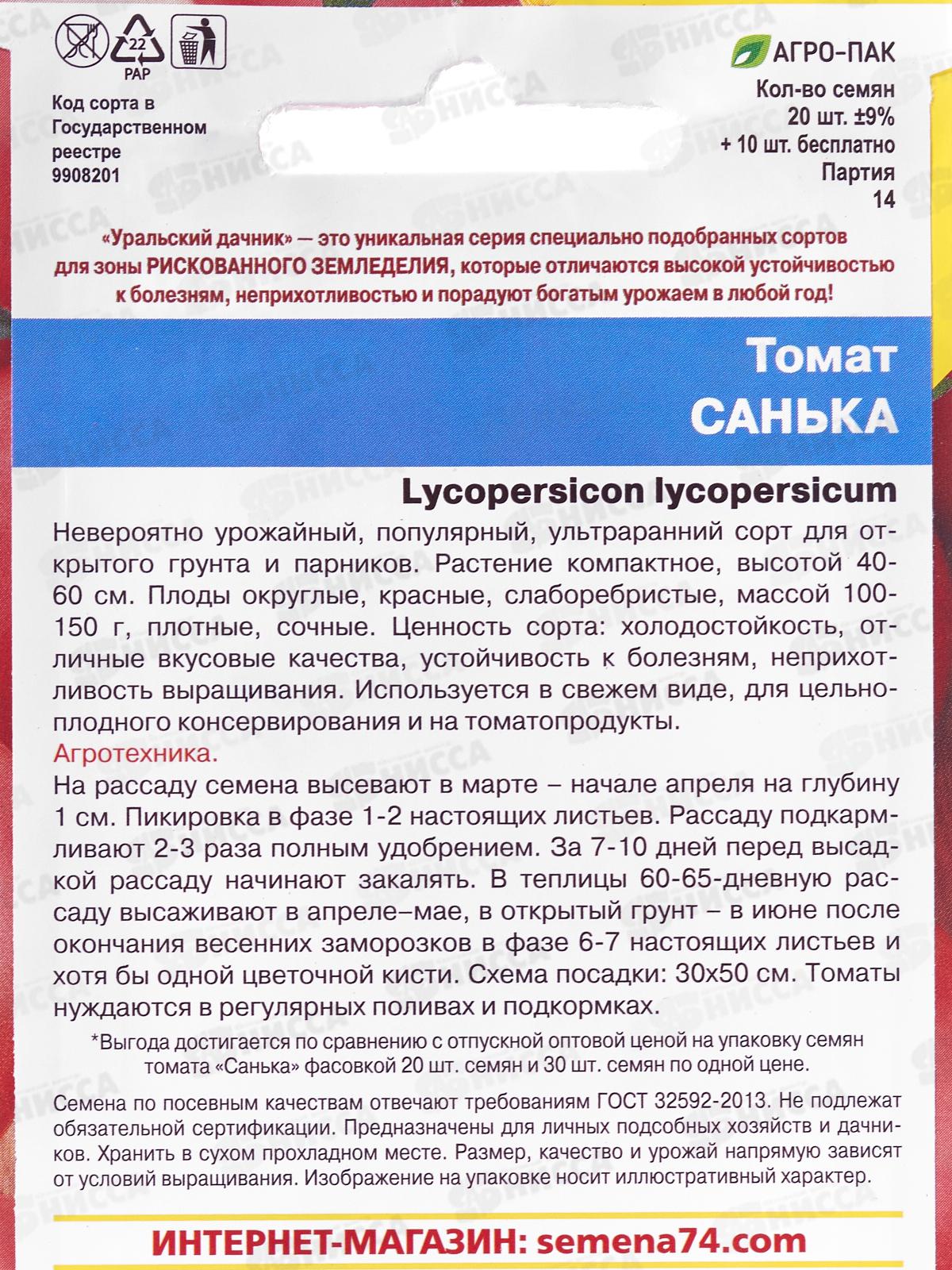 Томат Санька +50% бесплатно Евро *10 УрД +