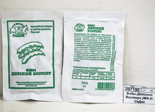 Среднеранний (от всходов до технической спелости 71-89 дней) сорт. Растения среднеоблиственные, высотой 1-1,2 м. Бобы длинные, широкие, сильноизогнутые, в технической спелости зеленые. Зерна крупные, удлиненно-овальные, белого цвета. Холодостойкая, влаго- и светолюбивая культура, выращивается на любых почвах, при любых погодных условиях. Посадки бобов отпугивают колорадских жуков и кротов, обогащают почву азотом. Ценность сорта: сверхнеприхотливость выращивания, отличные вкусовые качества недозрелых зерен. В пищу употребляются в свежем, вареном и консервированном виде. Рекомендуется для диетического питания.