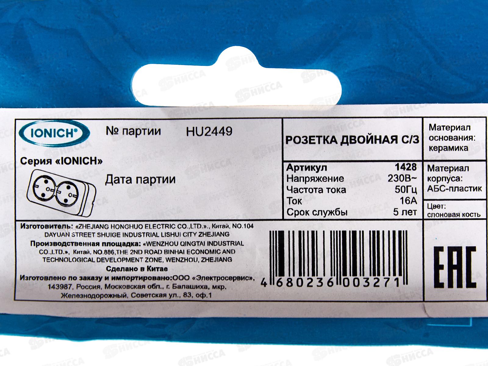 Розетка IONICH 2-местная открытой установки, с заземлением, 16А, 220В слоновая кость,керамика,1428*10