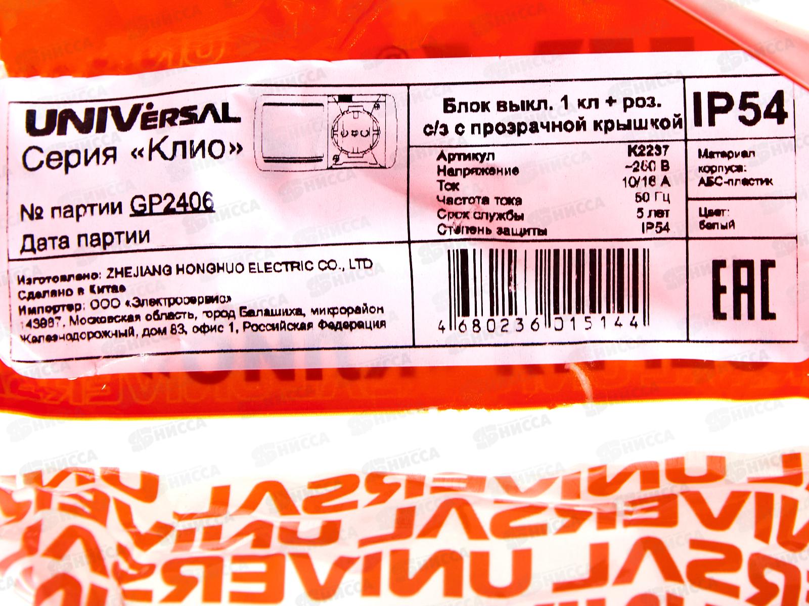 Блок горизонтальный КЛИО выкл. 1-клавиша, открытая установка + розетка 1-мес.с крыш., с/з, К2237*10