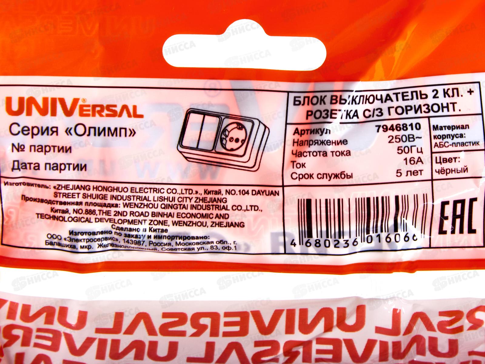 Блок горизонтальный ОЛИМП выключатель 2-клавиши, открытая установка + роз 1-мес., с/з,черный 7946810*10
