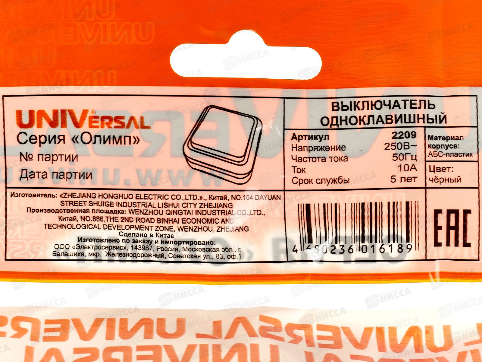 Выключатель ОЛИМП 1-клавиша открытой установки, 10А, 220В черный, 2209 *10