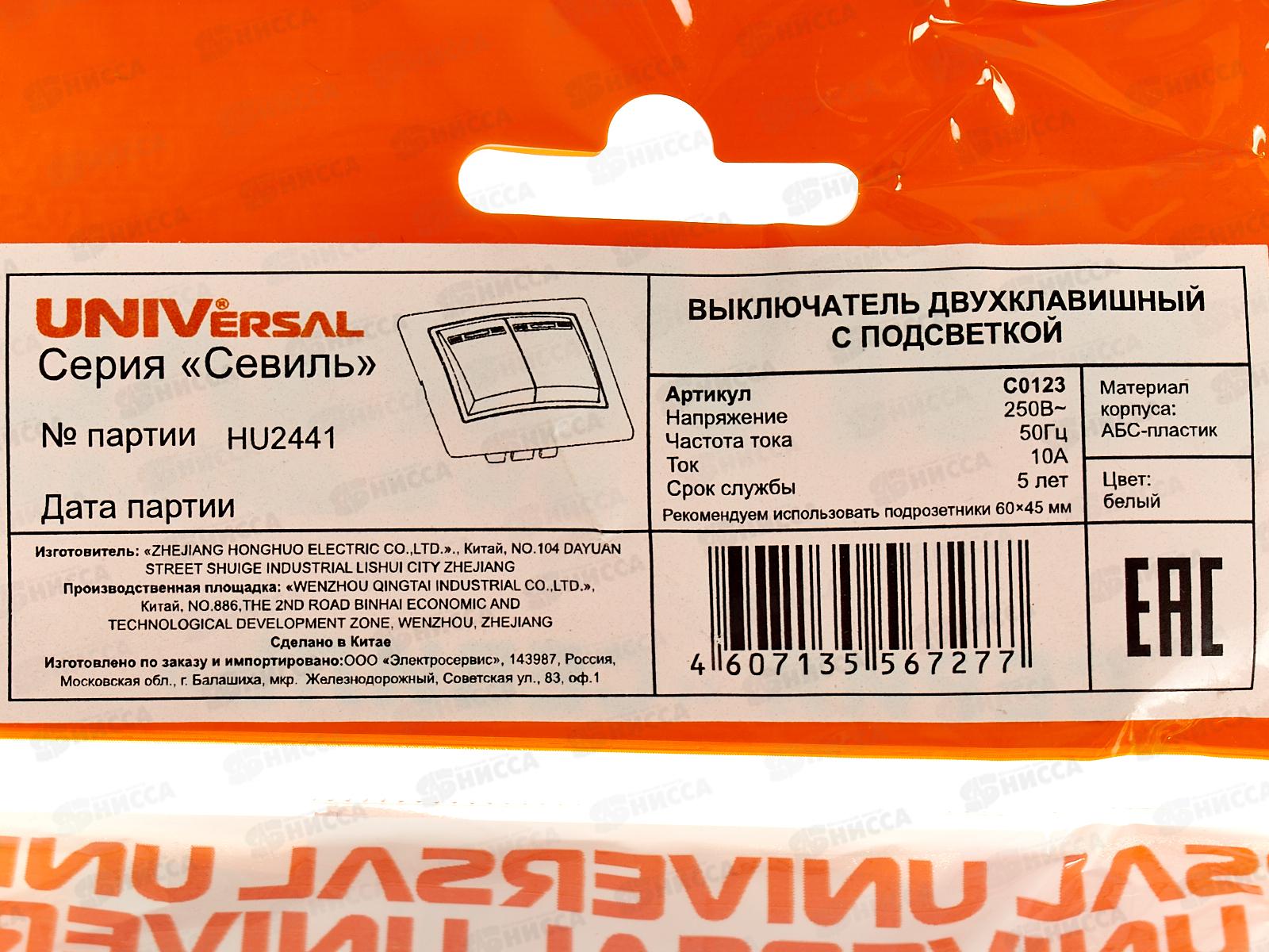 Выключатель Севиль 2-клавиши скрытой установки, 10А, 220В, подсвет.. белый, С0123 *10