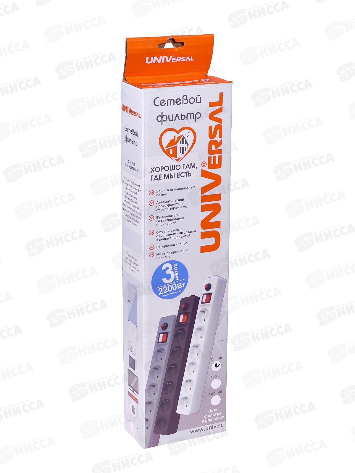 Сетевой фильтр UNIVersal ПВС 3*0,75 6 гн, 3м выкл. с идик, с/з,з/щ белый, 967U-3003